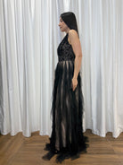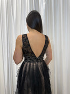 Un modello elegante e d’impatto, perfetto per le serate più speciali. Il corpetto in pizzo nero con profondo scollo a V è abbinato a una gonna leggera in tulle a balze sovrapposte, che crea volume senza appesantire la figura. Il retro scollato aggiunge un tocco sensuale ma raffinato.