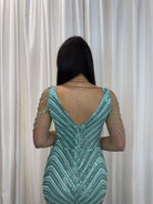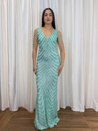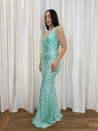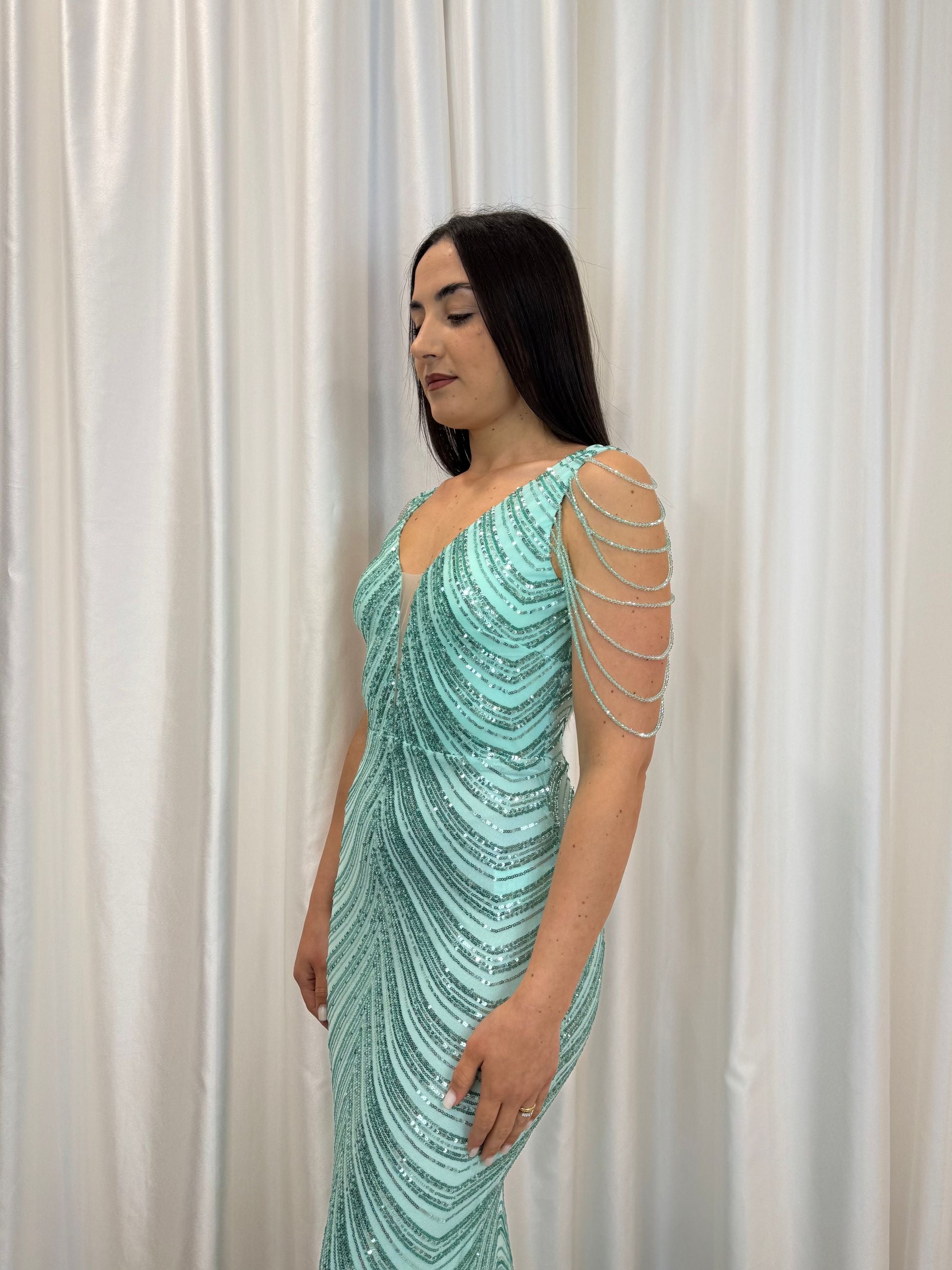 Un’esplosione di luce e raffinatezza: questo abito lungo verde acqua è interamente ricamato con paillettes che disegnano linee ondulate ultra femminili. Le spalline con fili gioiello donano eleganza e originalità, mentre il taglio aderente valorizza la silhouette.