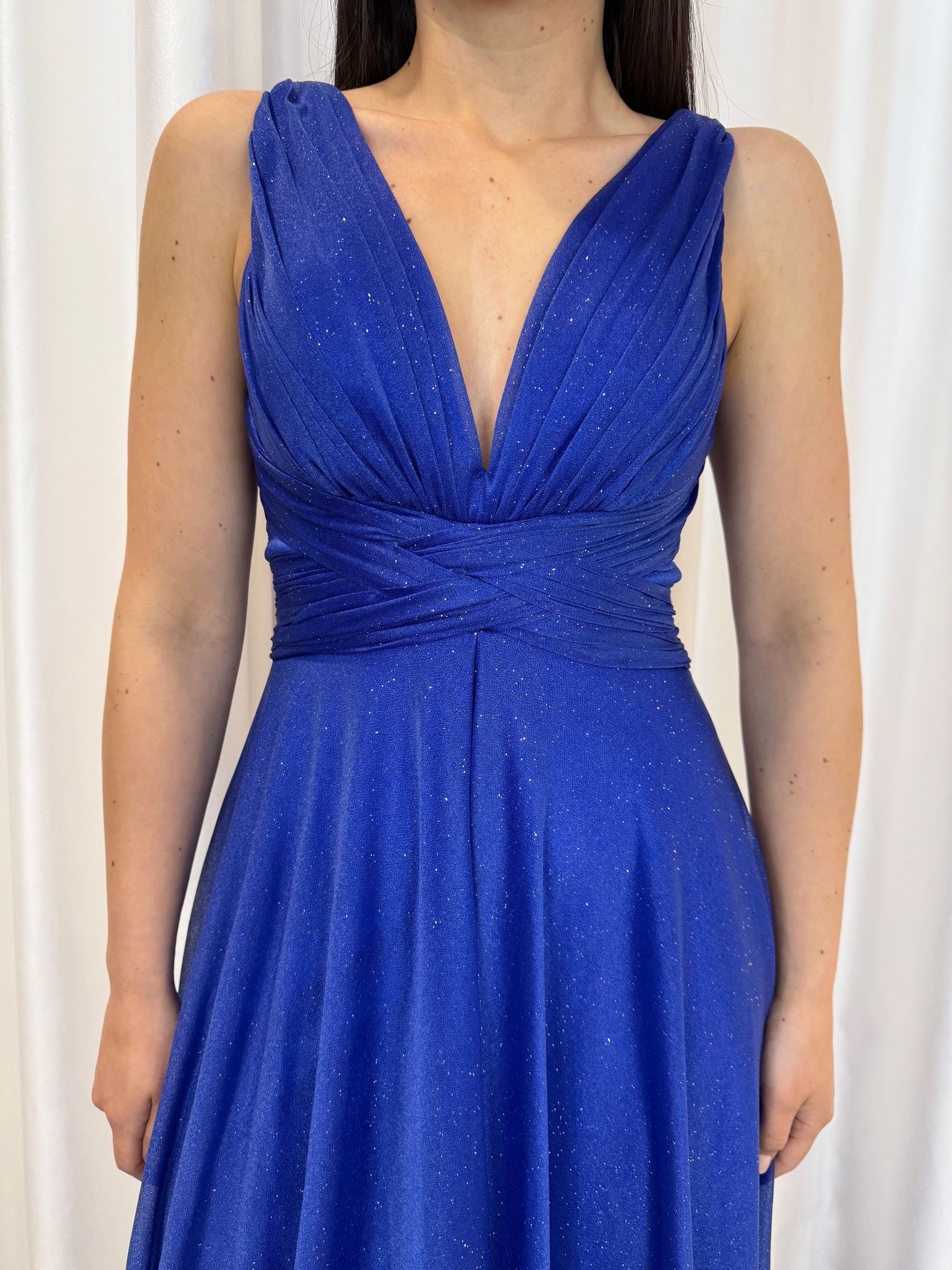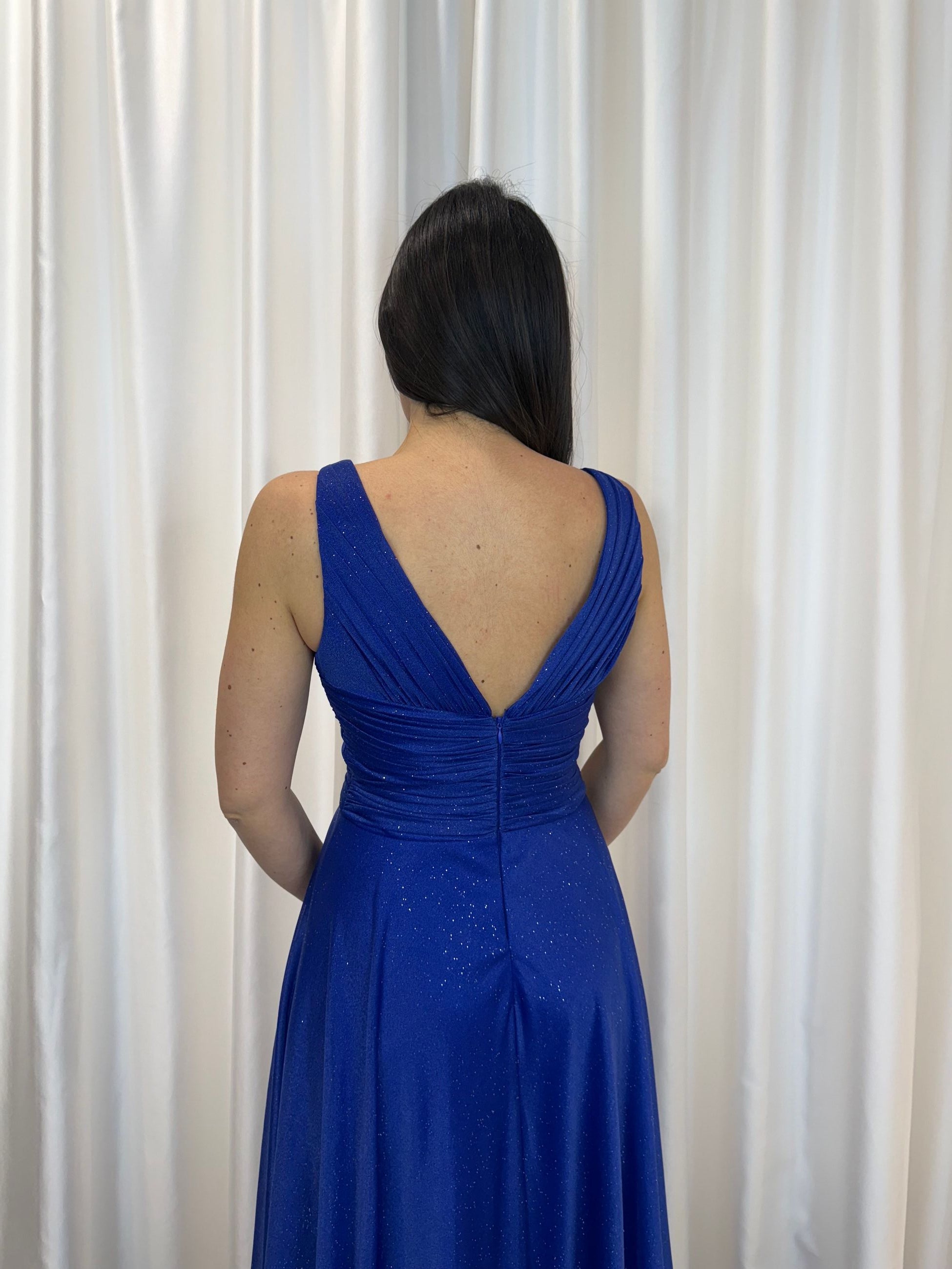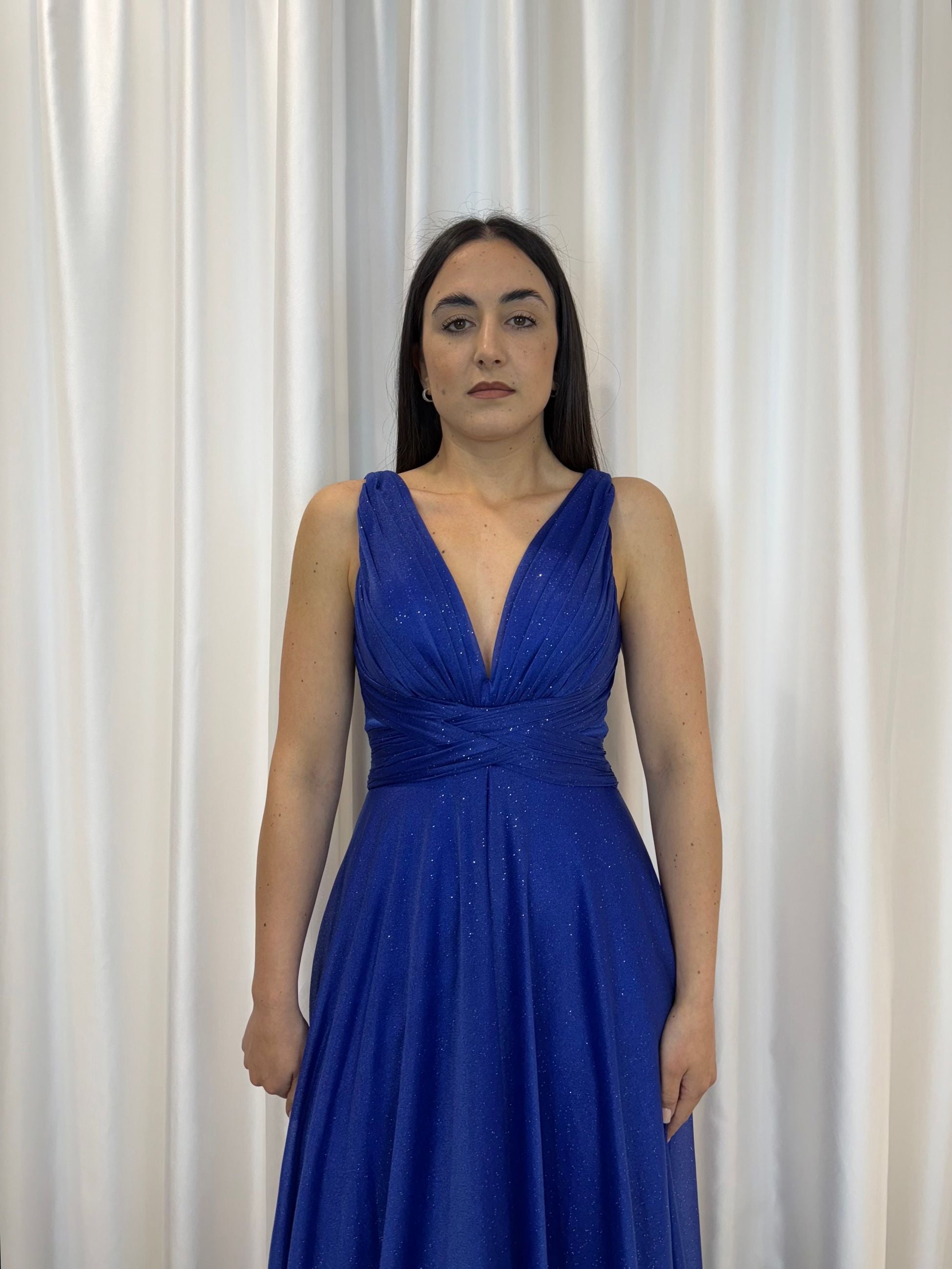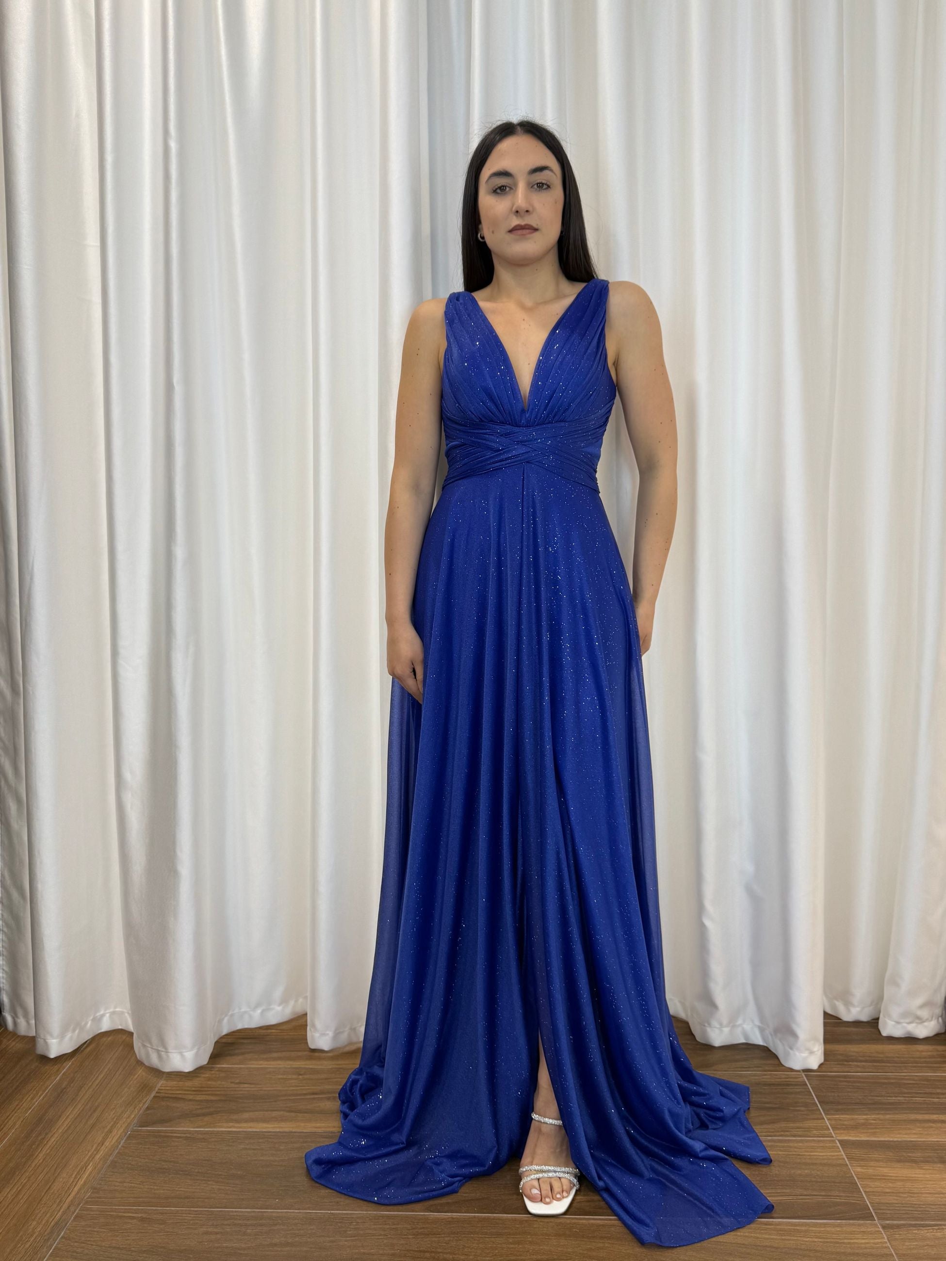 Scopri l’abito da cerimonia perfetto per brillare con stile. Questo abito lungo blu, impreziosito da micro glitter, è l’ideale per invitate, damigelle o eventi. Il profondo scollo a V sul davanti e sul retro esalta la femminilità, mentre il drappeggio in vita valorizza la silhouette. La gonna fluida con spacco centrale aggiunge un tocco moderno e sofisticato.