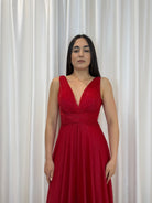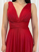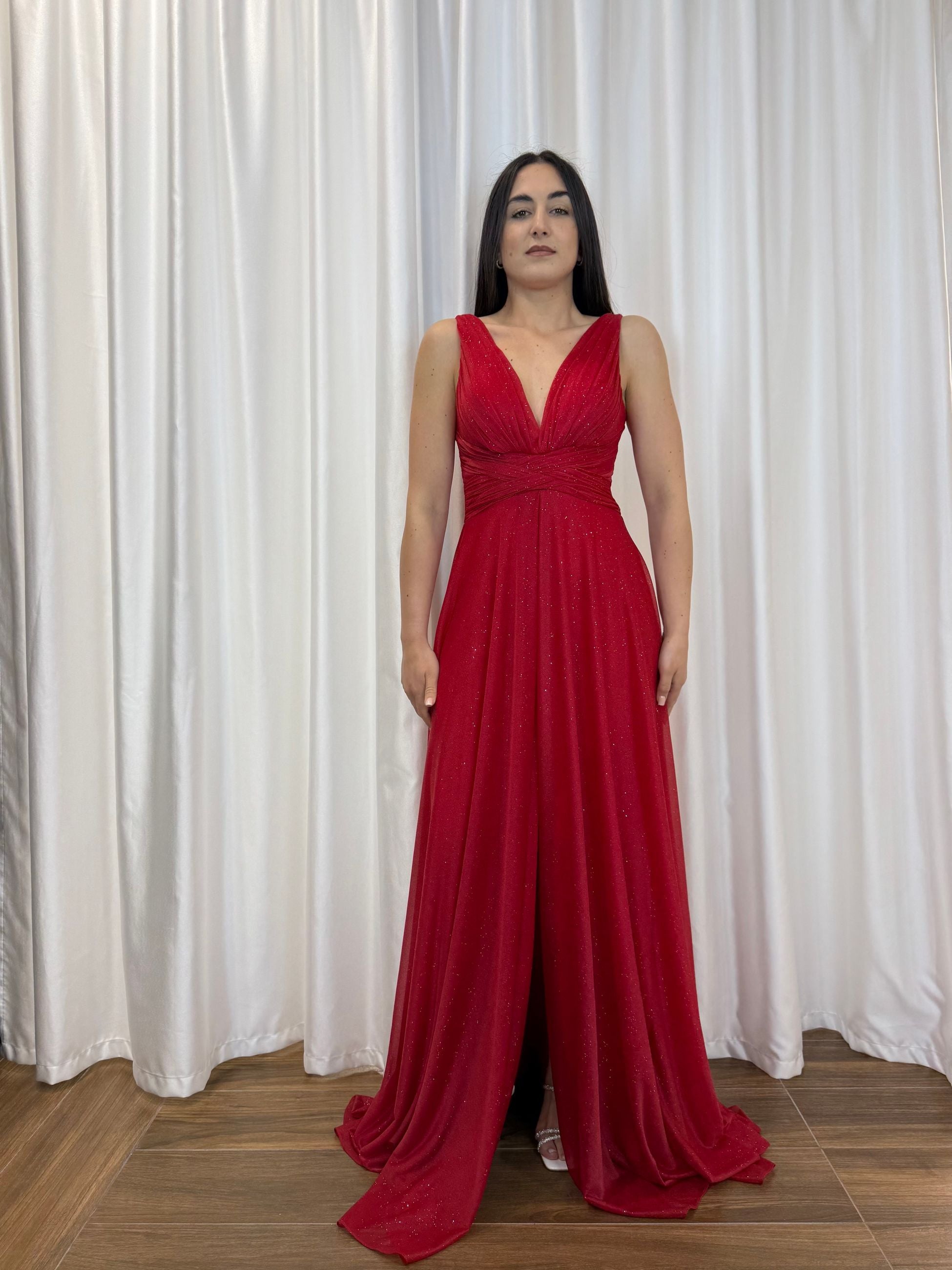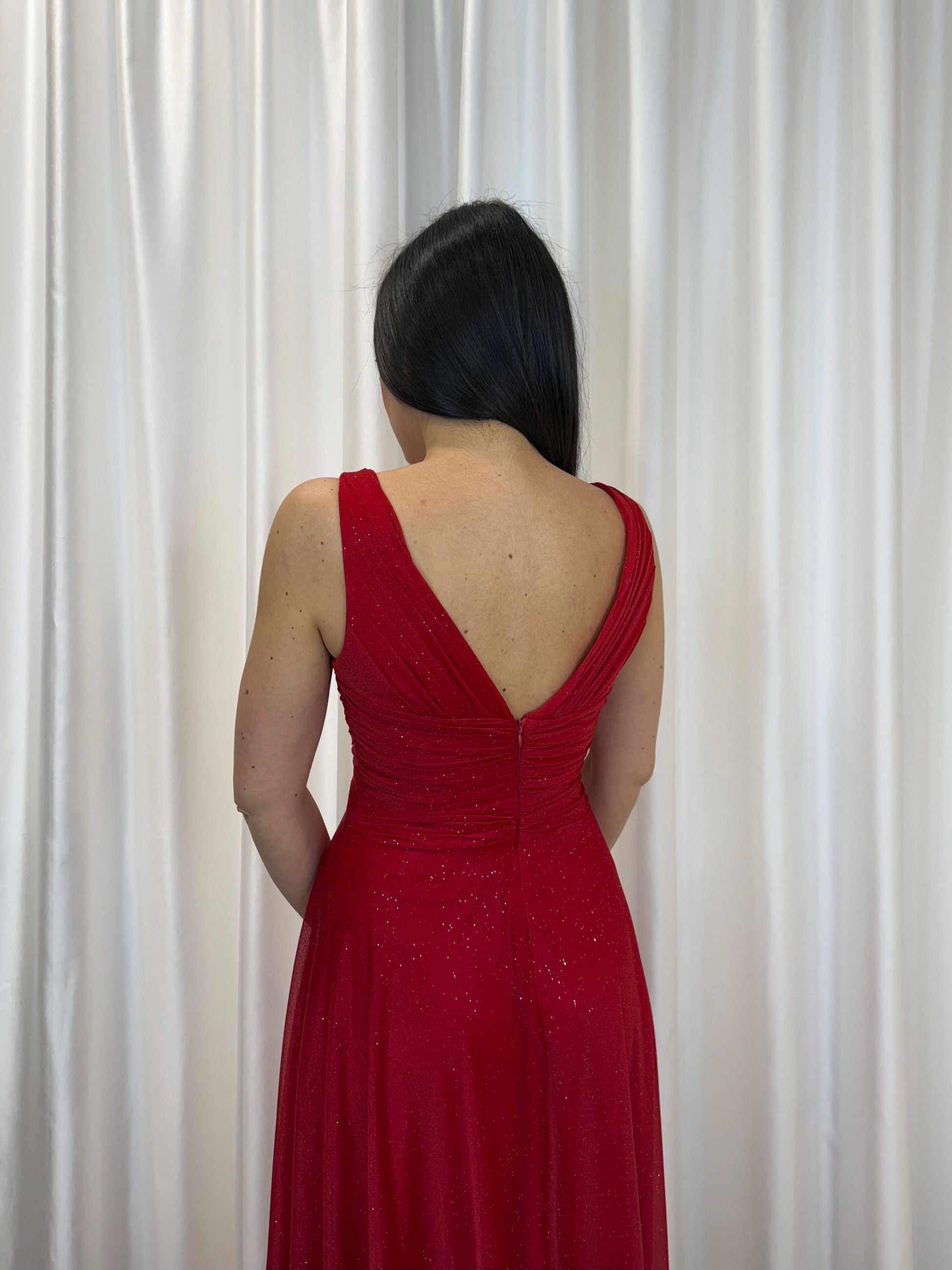 Scopri l’abito da cerimonia perfetto per brillare con stile. Questo abito lungo rosso, impreziosito da micro glitter, è l’ideale per invitate, damigelle o eventi. Il profondo scollo a V sul davanti e sul retro esalta la femminilità, mentre il drappeggio in vita valorizza la silhouette. La gonna fluida con spacco centrale aggiunge un tocco moderno e sofisticato.
