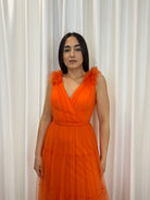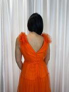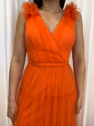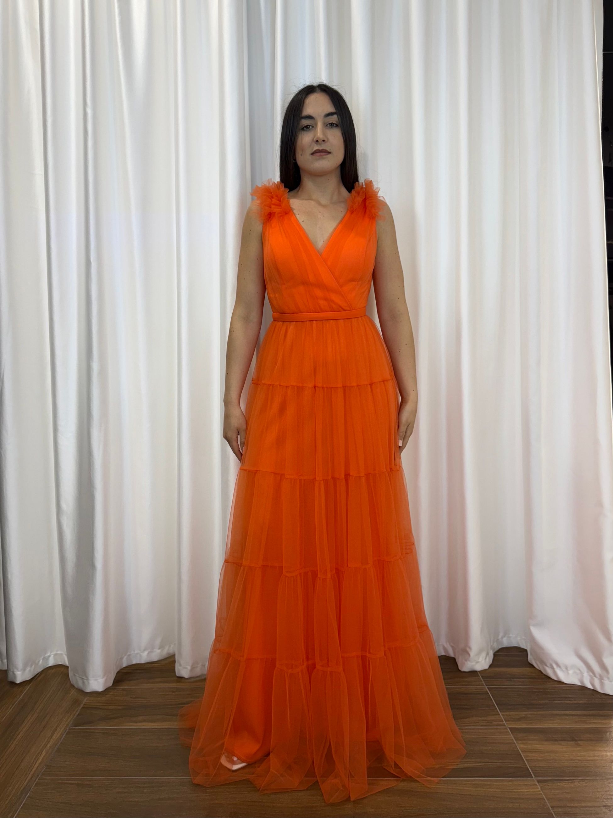 Vibrante, elegante e dal carattere deciso: questo abito lungo arancio è pensato per chi ama farsi notare con classe. Il corpino incrociato valorizza il décolleté, mentre le spalline adornate da maxi applicazioni in tulle aggiungono un tocco romantico e sofisticato. La gonna in tulle leggero dona volume e movimento, perfetta per danzare tutta la notte.