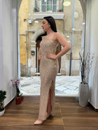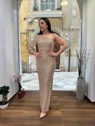 Eleganza e raffinatezza si fondono in questo abito monospalla interamente ricoperto di paillettes oro.