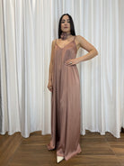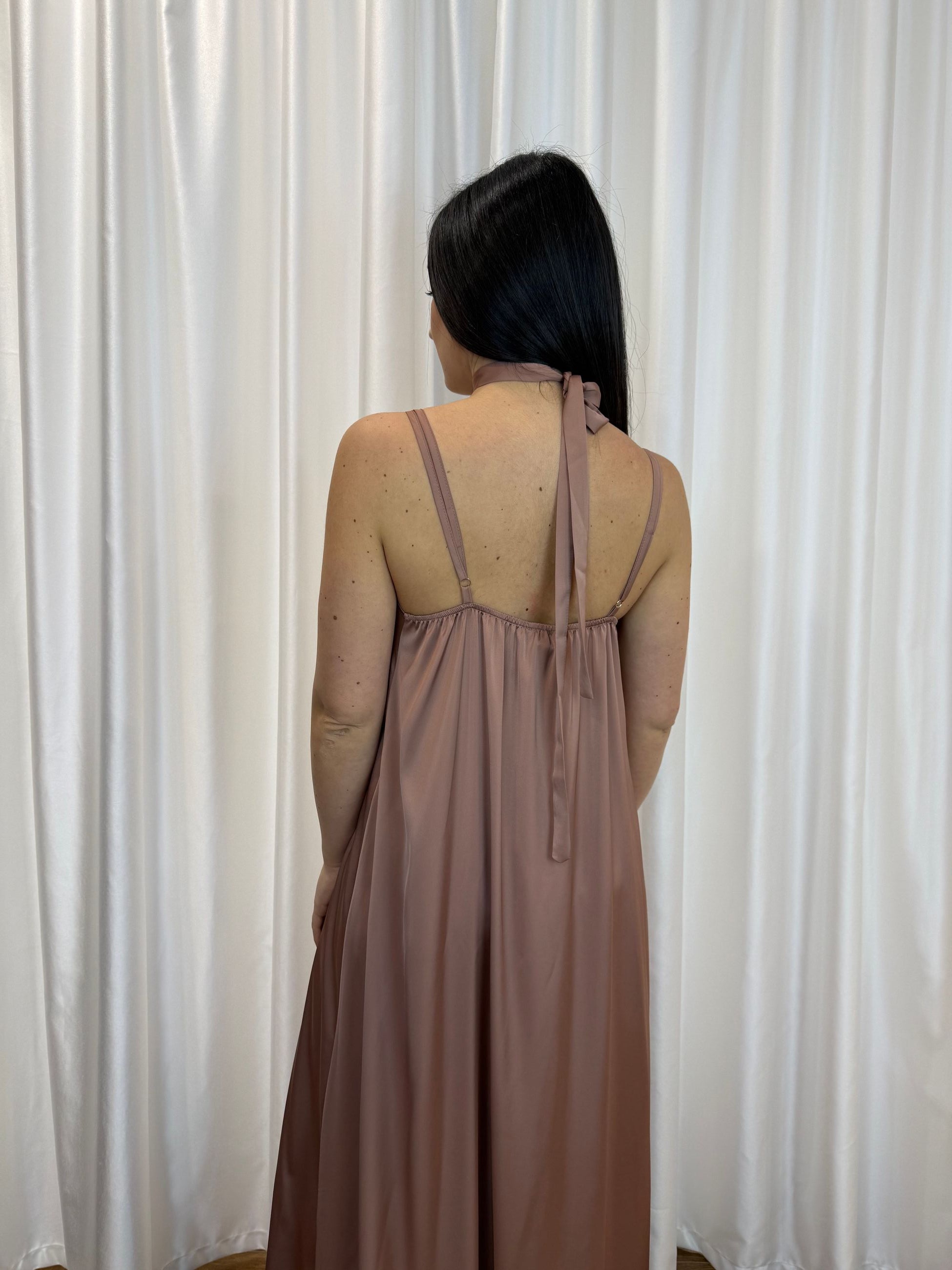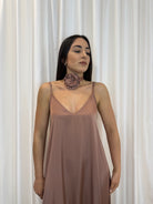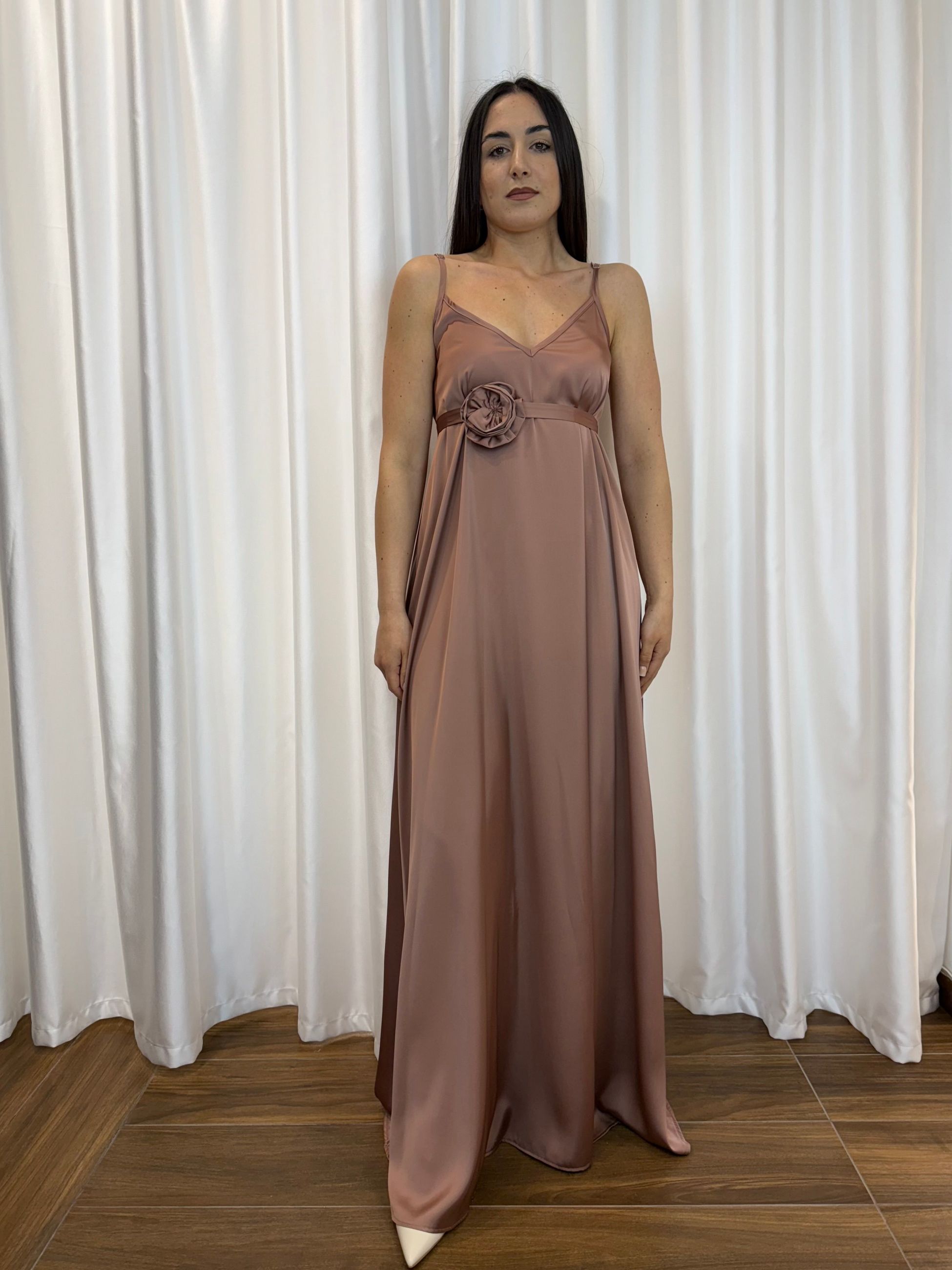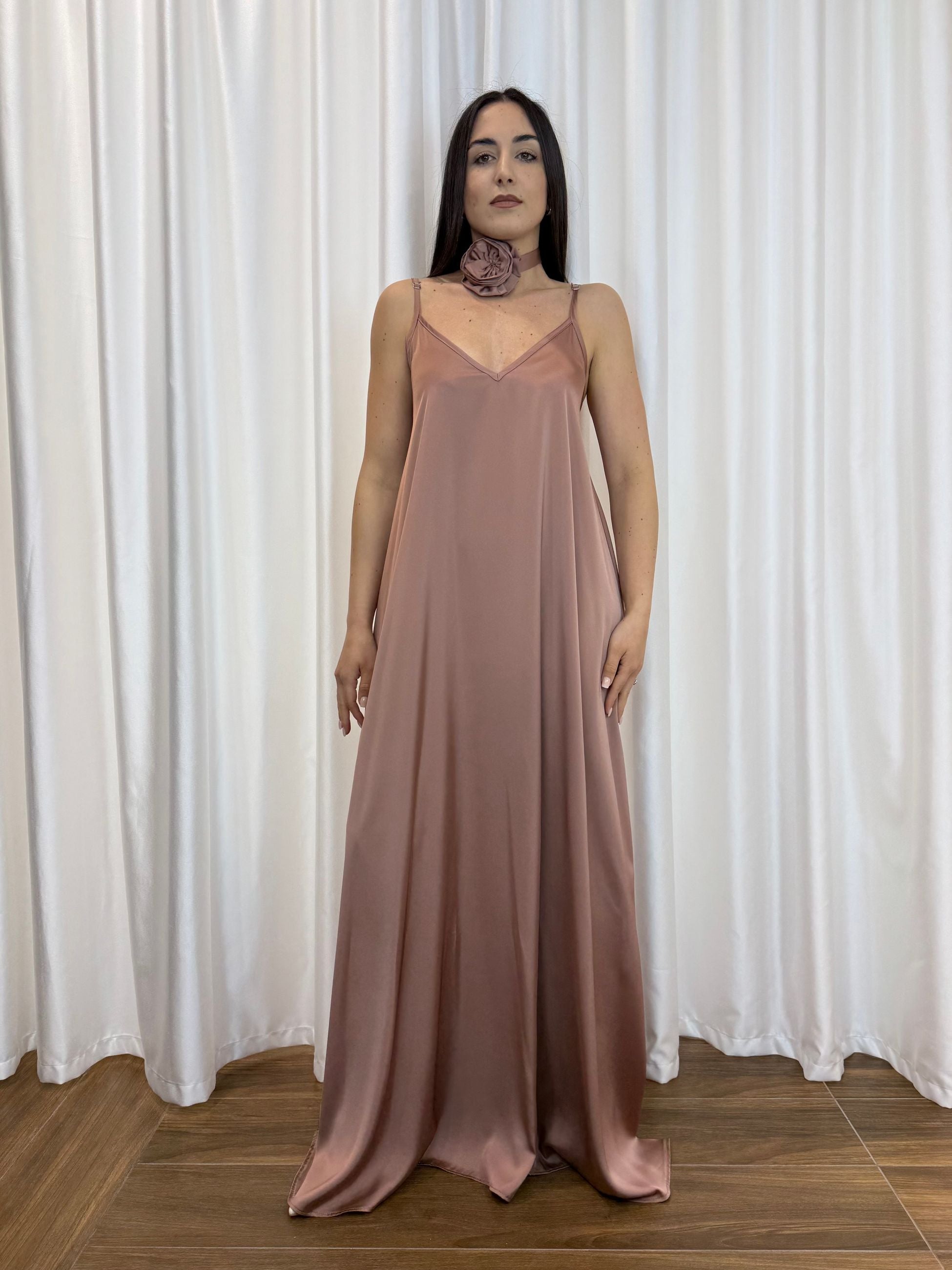 Fluidità e charme si incontrano in questo abito lungo in raso dal fascino senza tempo. Il taglio scivolato valorizza la figura con discrezione, mentre il dettaglio del maxi fiore tono su tono – indossabile sia al collo che sotto il seno – aggiunge un tocco couture e personalizzabile. Raffinato, leggero e seducente: perfetto per cerimonie, eventi estivi o cene eleganti.