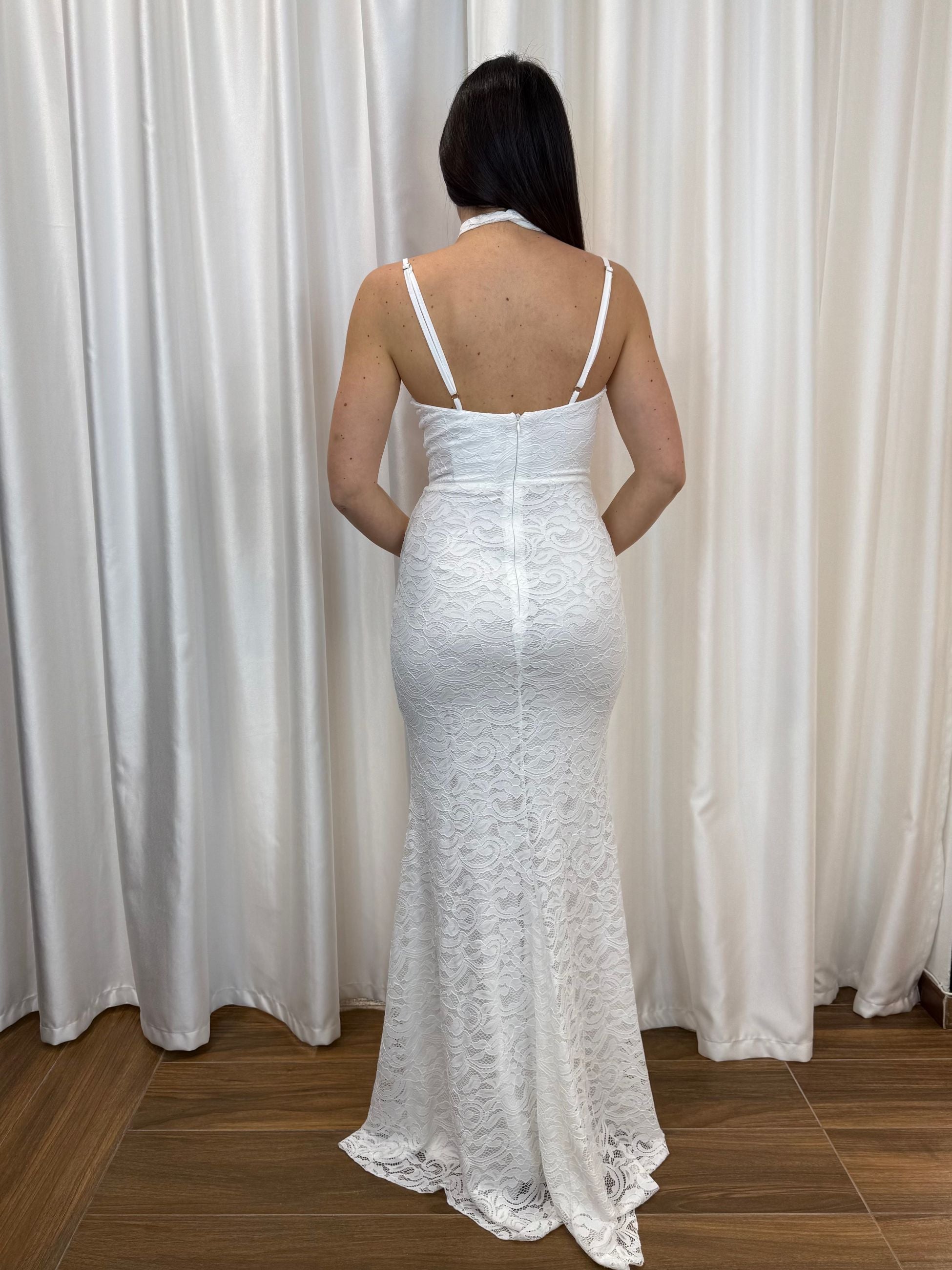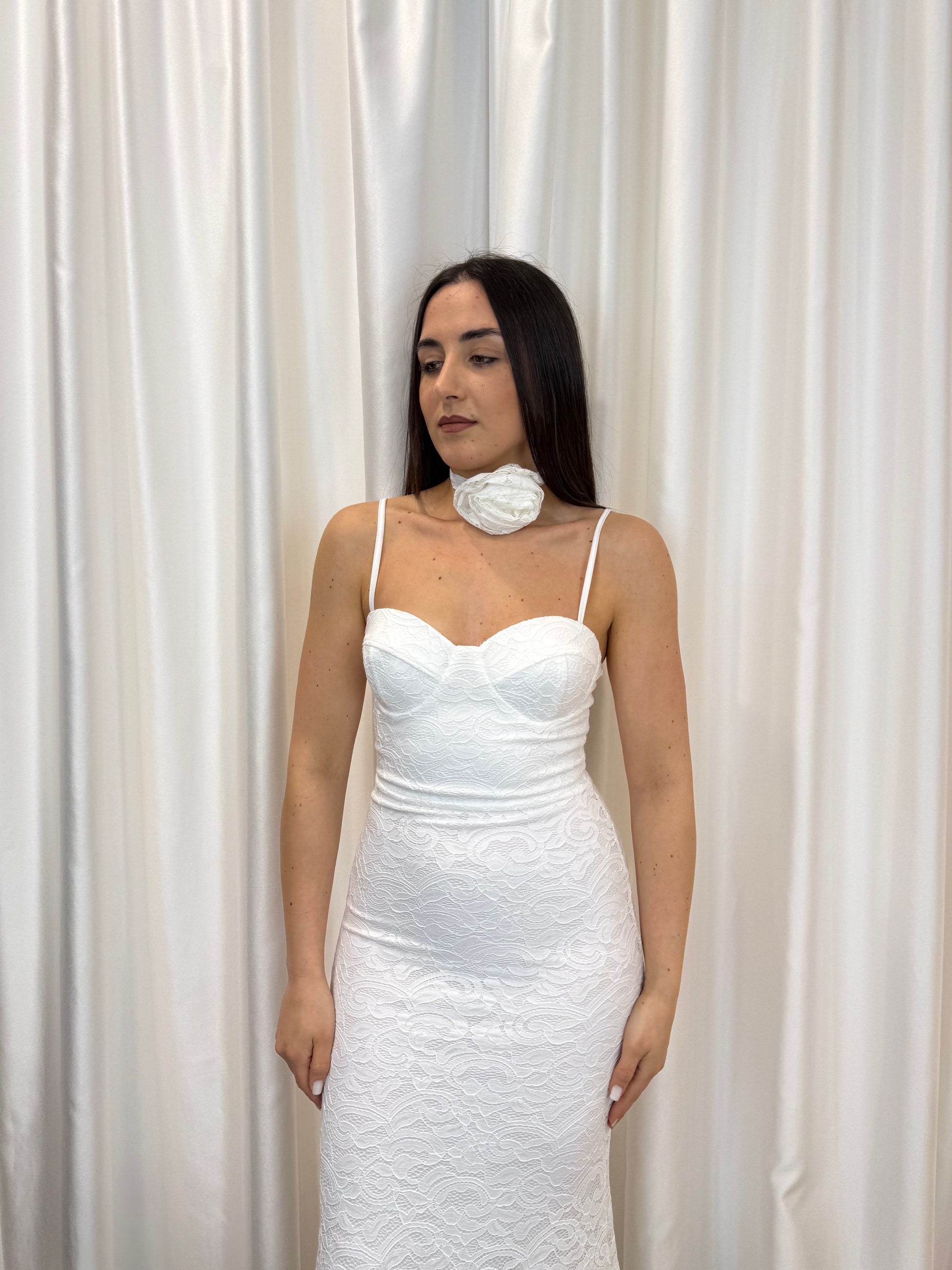 Un abito che incanta con la sua semplicità raffinata e la lavorazione in pizzo. Perfetto per cerimonie civili, feste eleganti o come cambio d’abito per la sposa.