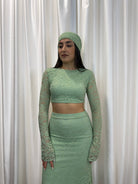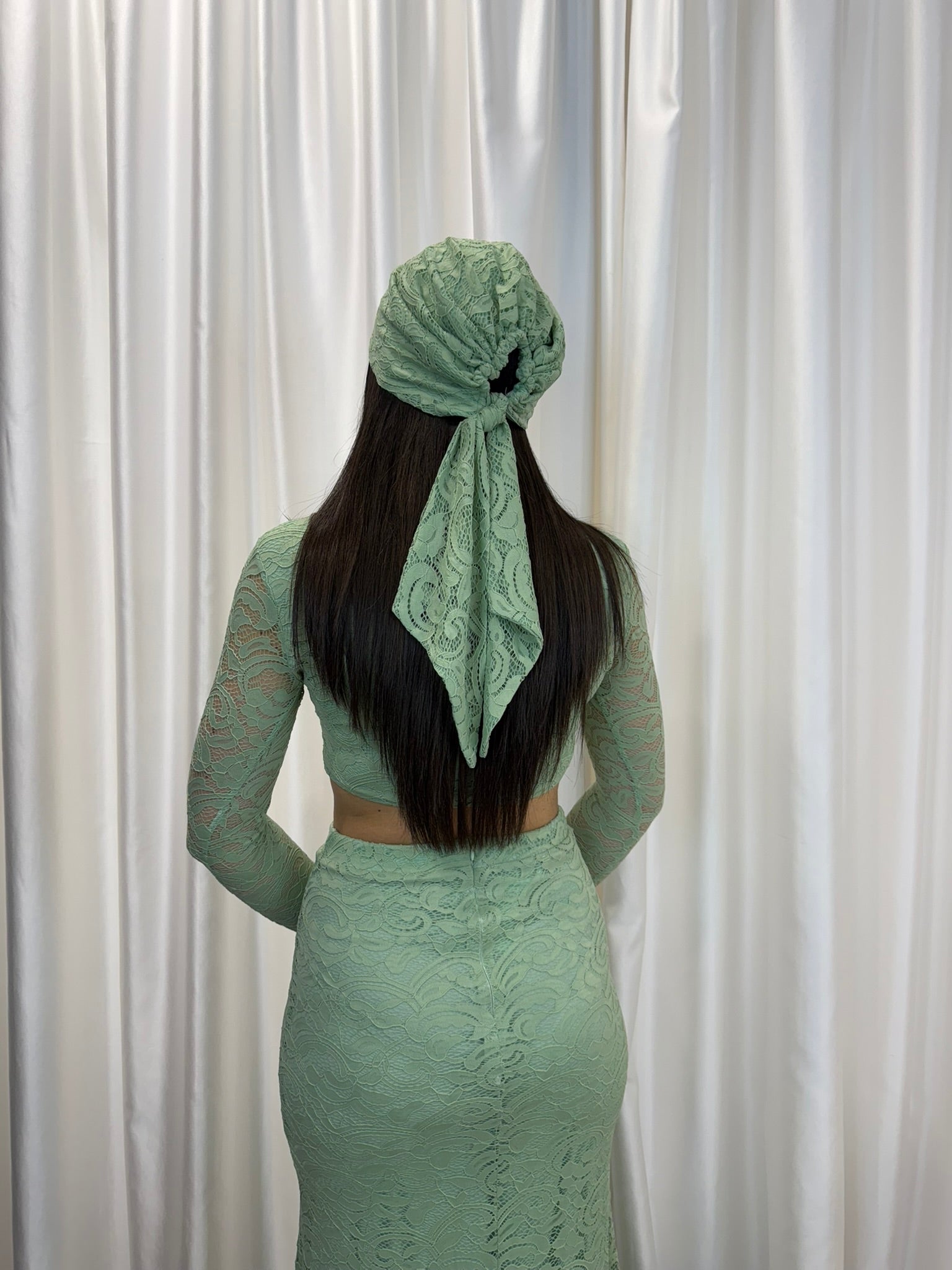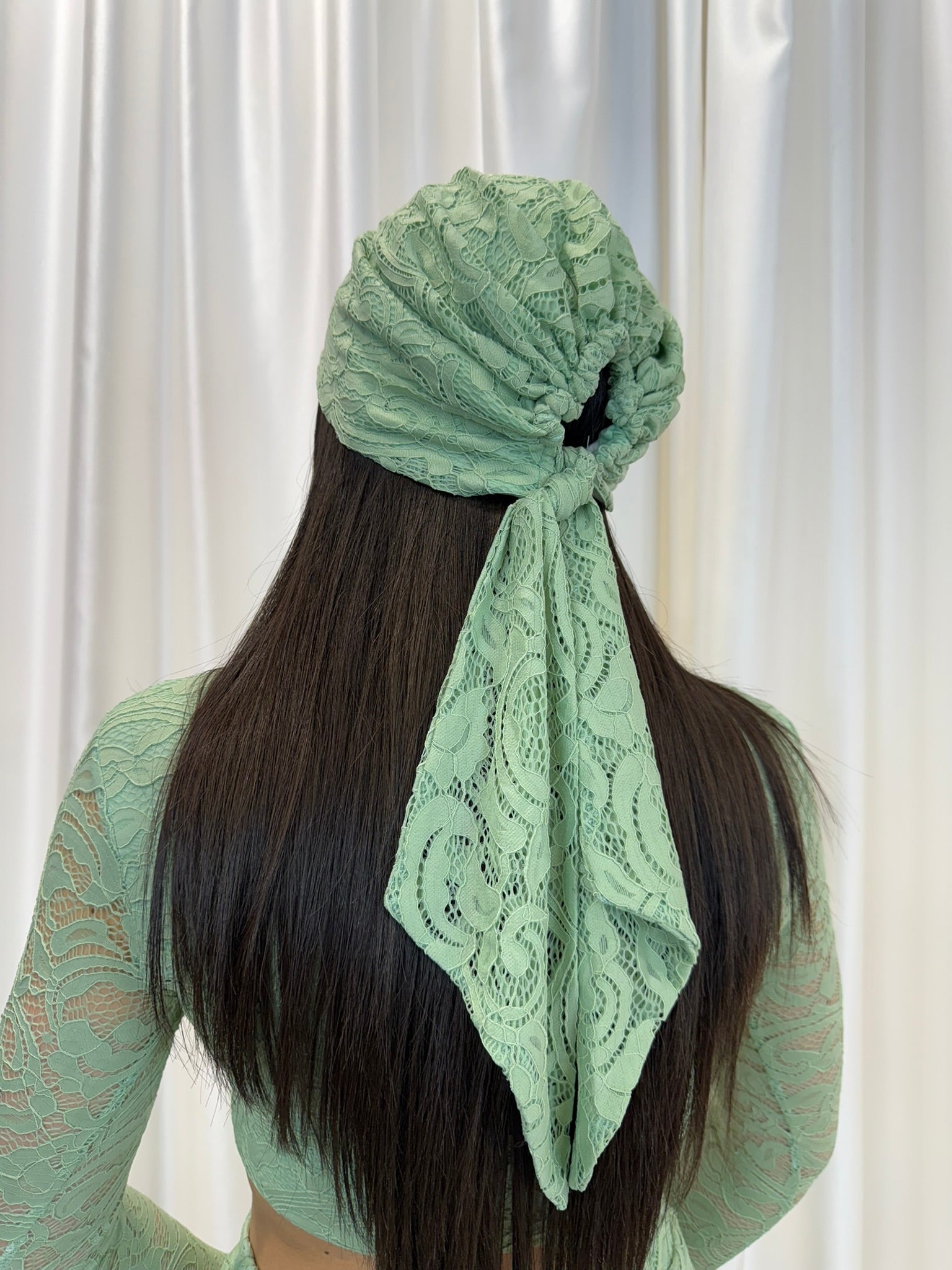 Questo foulard in pizzo verde menta aggiunge un tocco glamour a qualsiasi look, perfetto per impreziosire un outfit estivo o cerimonia con stile e personalità.