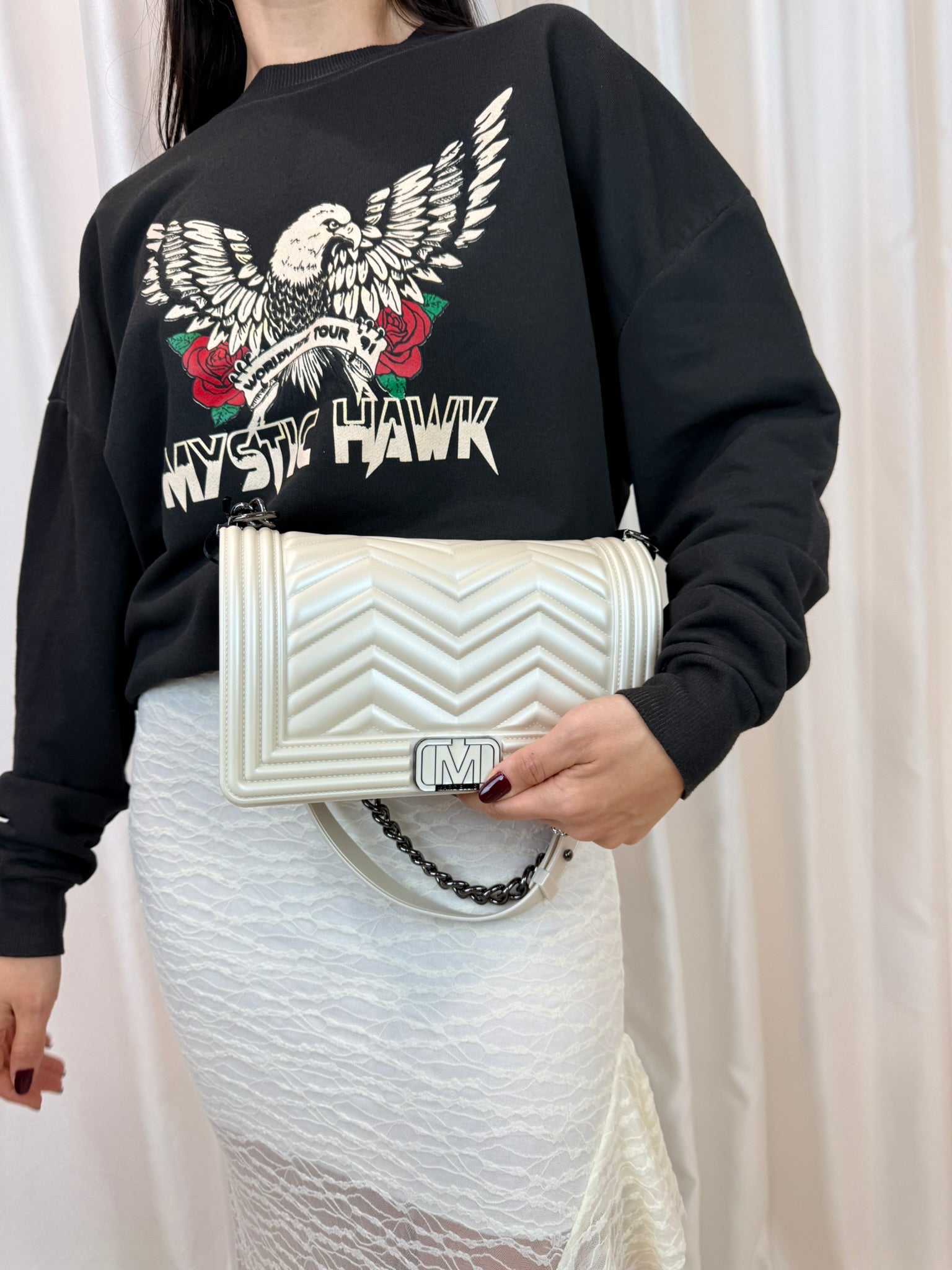 Lasciati conquistare da questa borsa a spalla che incarna l'audacia e lo stile contemporaneo.