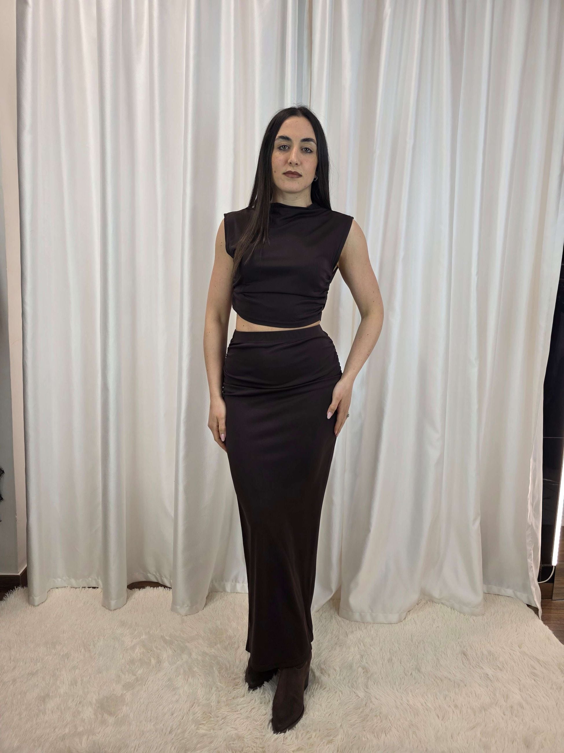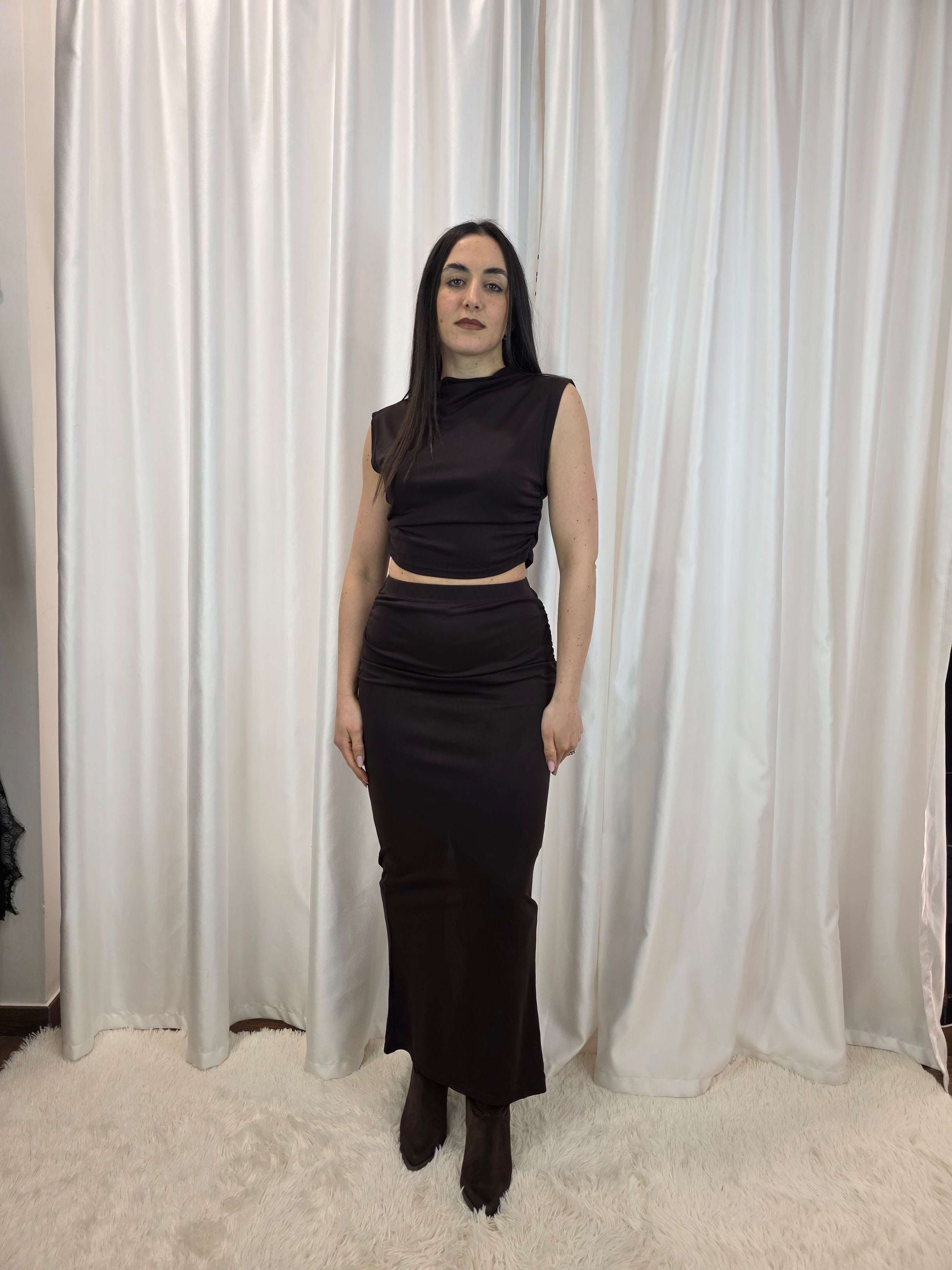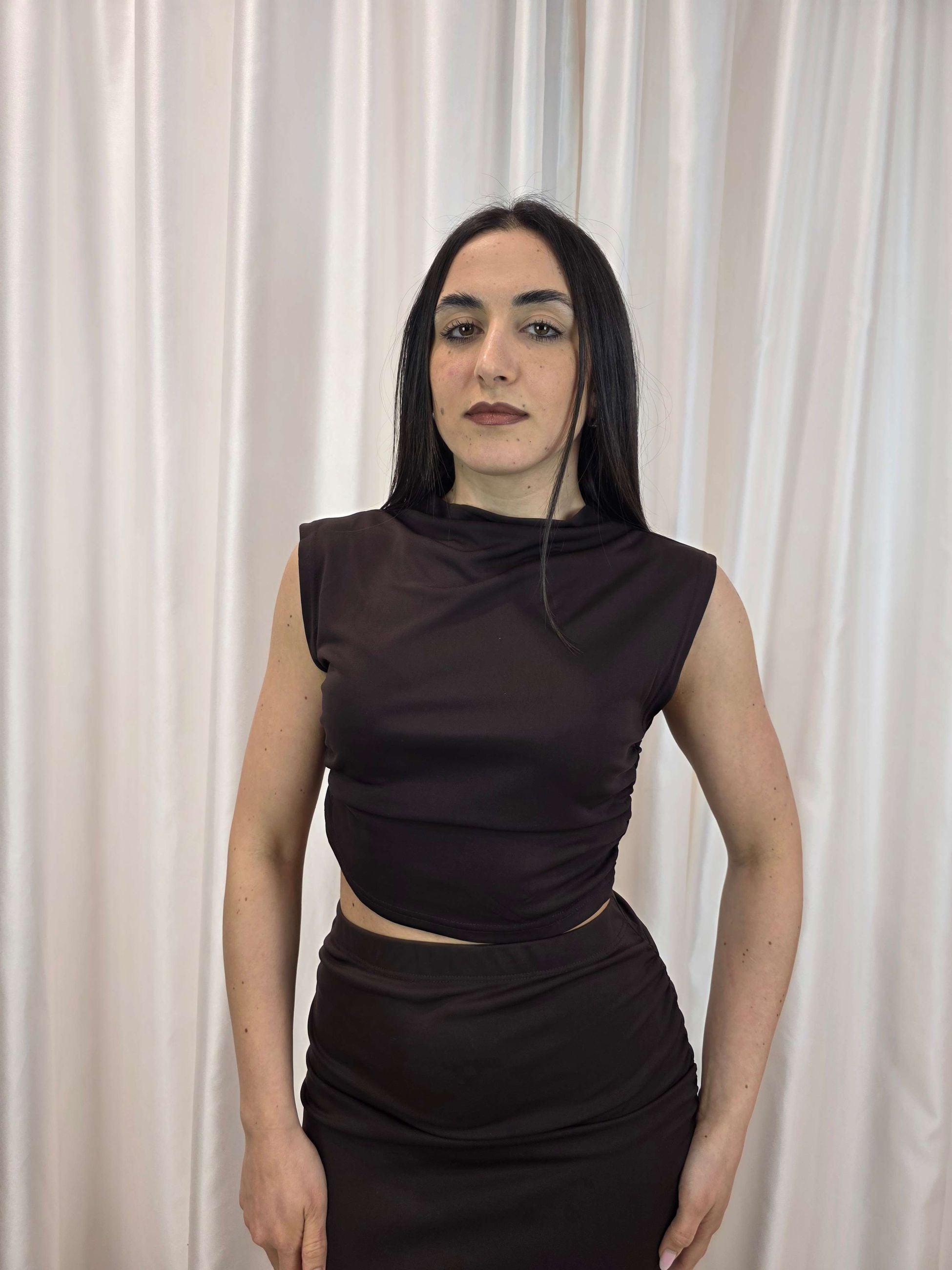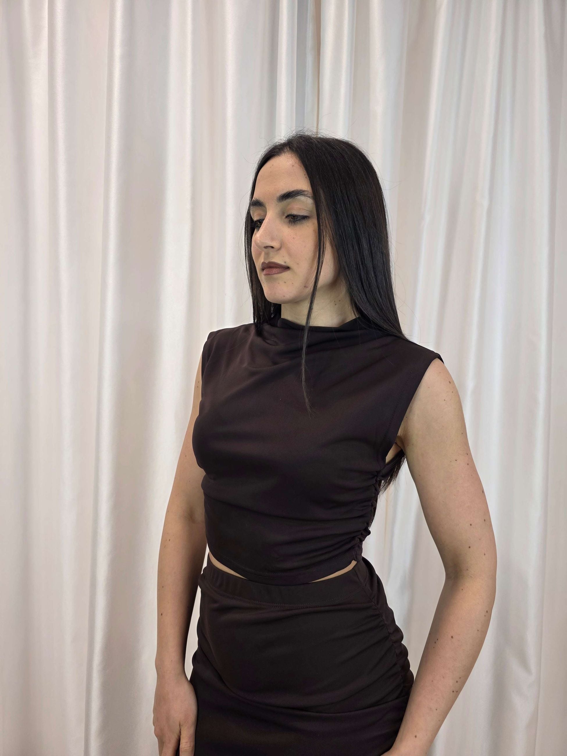 Top donna smanicato con drappeggio cioccolato – Glamorous