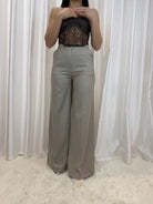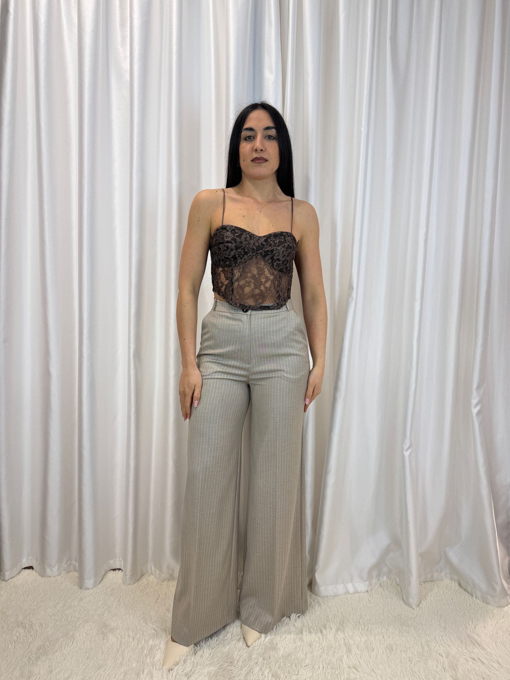 Questo pantalone gessato a palazzo valorizza la silhouette con una linea fluida e raffinata, perfetto per creare look sofisticati ma contemporanei.