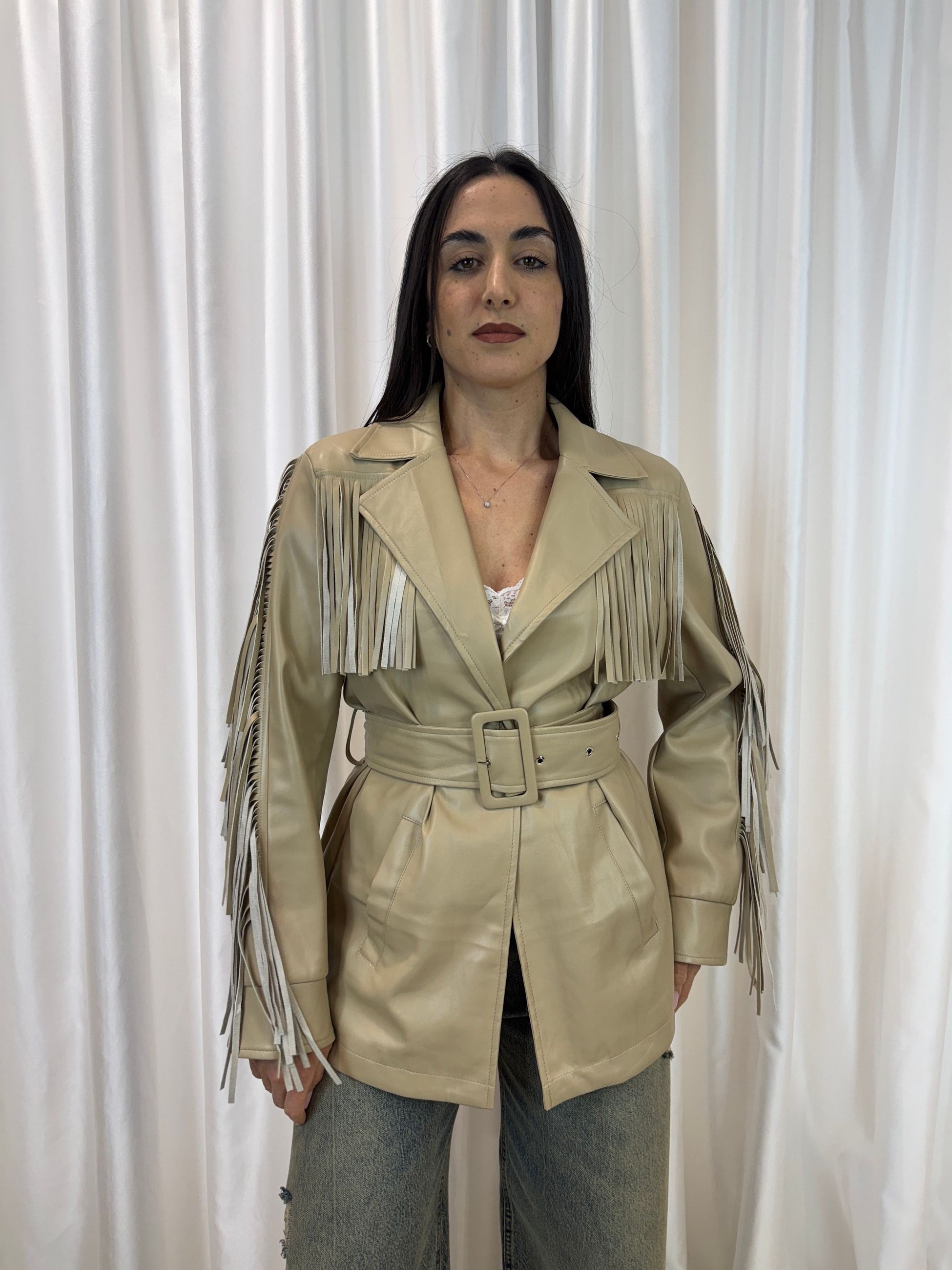 Questa giacca in ecopelle con frange è il capo statement perfetto per chi vuole distinguersi con stile, unendo eleganza e spirito western rivisitato in chiave moderna.