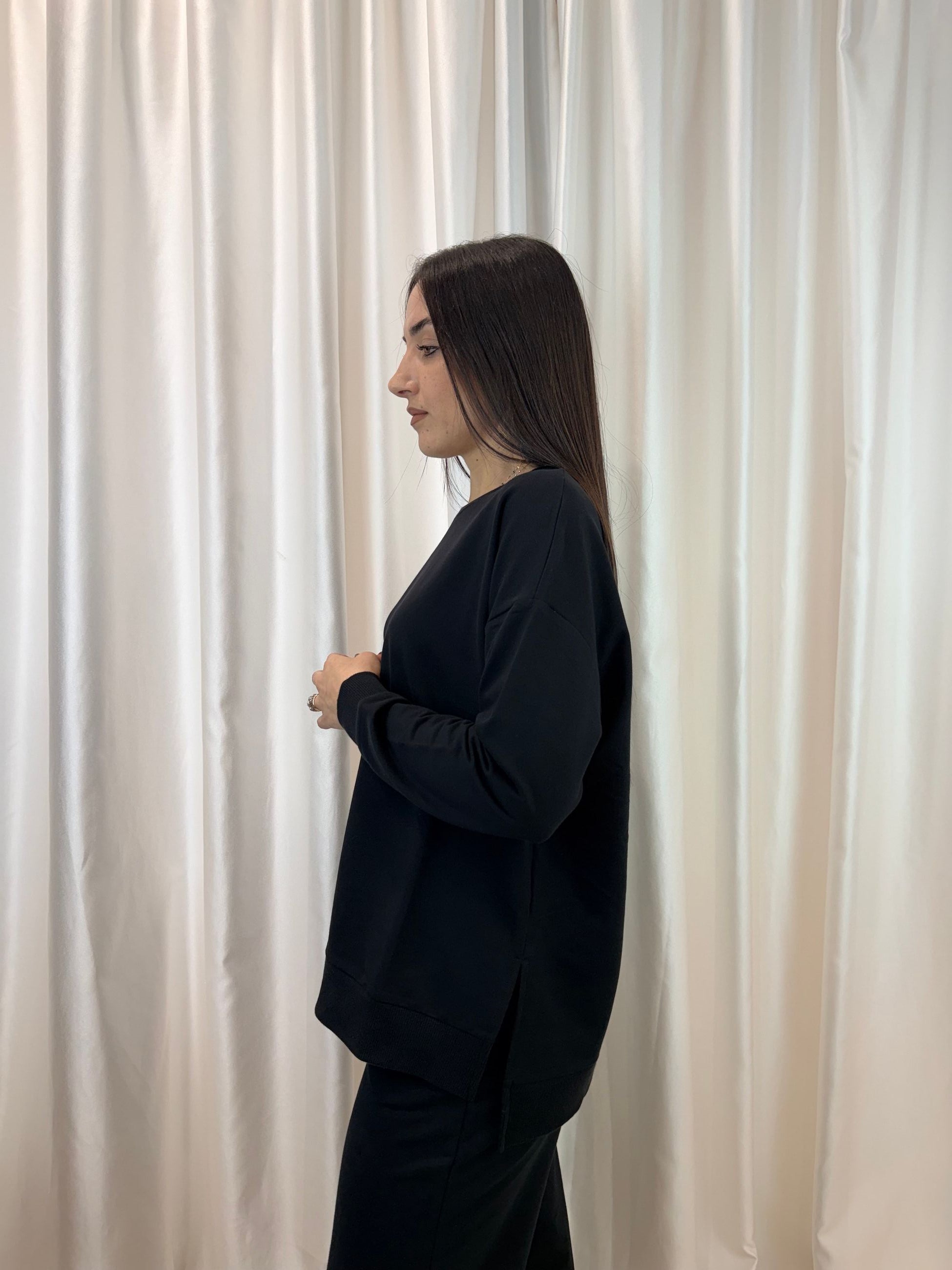 Una felpa semplice ma mai banale, perfetta per i tuoi look casual e rilassati. Il suo taglio morbido e i piccoli spacchetti laterali donano un tocco contemporaneo e la rendono ideale da abbinare a una camicia per uno stile curato ma senza sforzo.