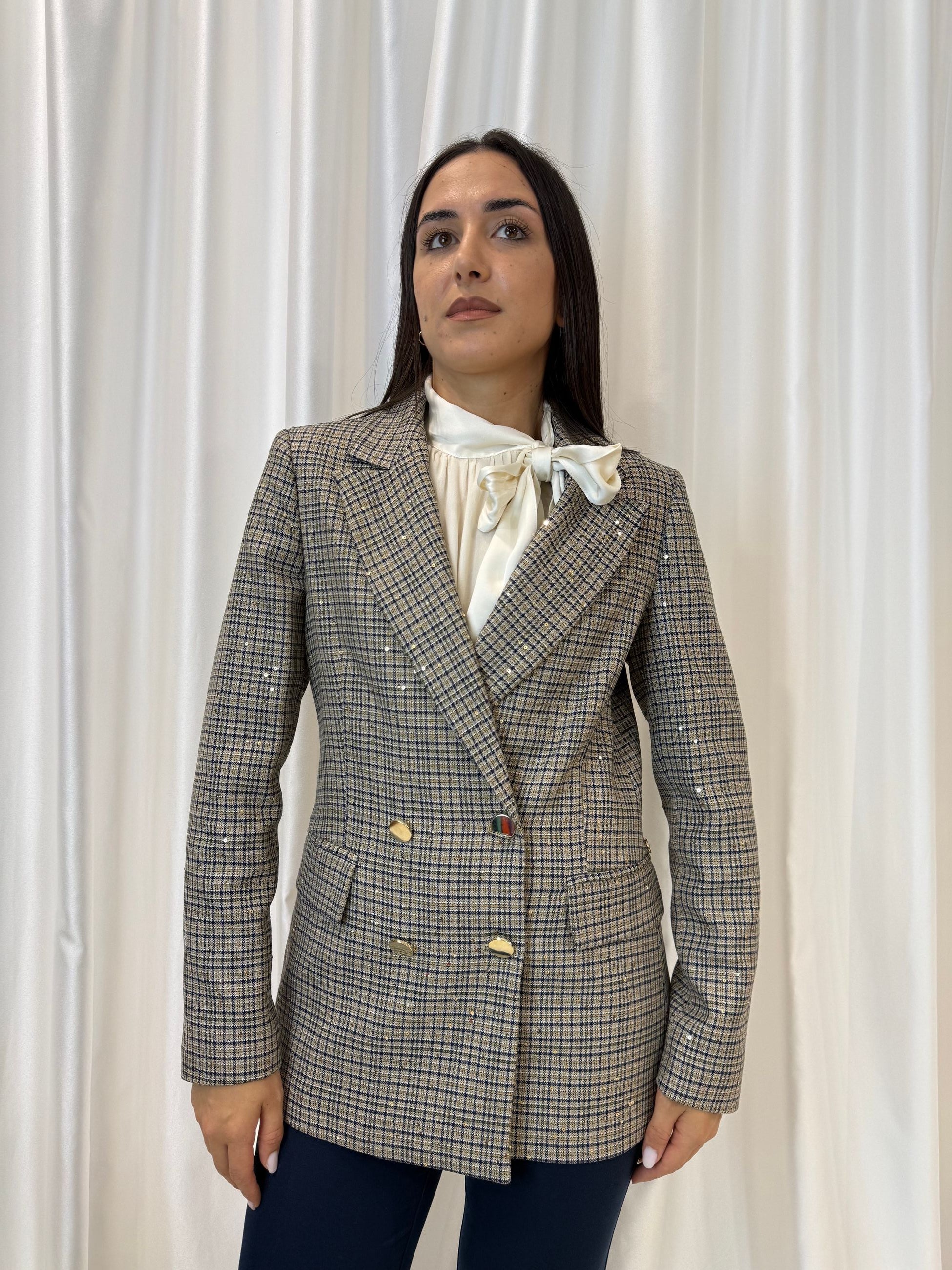 Giacca Erica Bellucci in tessuto tartan sui toni del blu con micro paillettes integrate che illuminano la trama. Modello doppiopetto con rever classico, bottoni dorati e tasche frontali. Un capo elegante e versatile, perfetto per completare look da ufficio o serate chic, indossato con gonne o pantaloni in tinta unita.