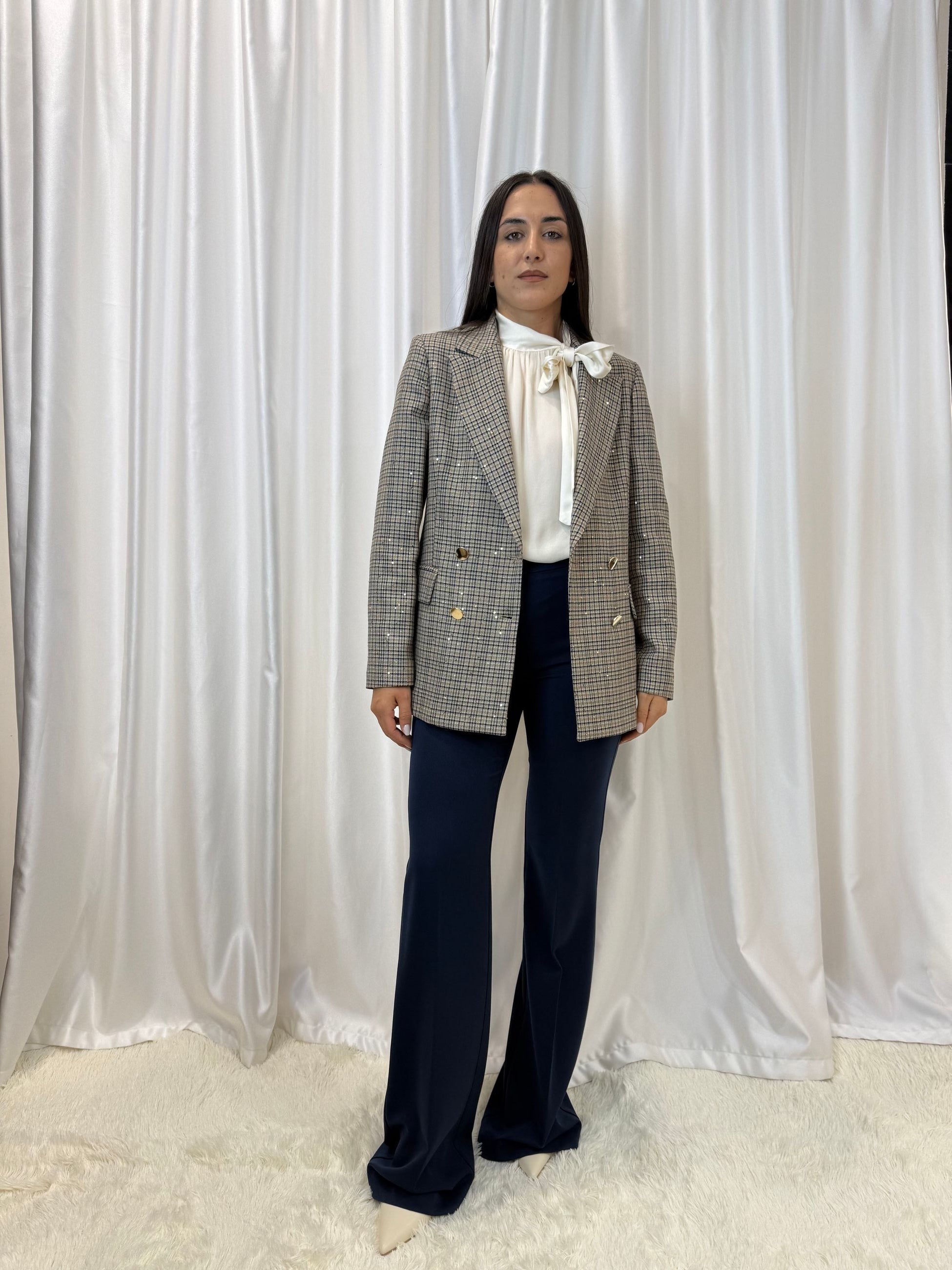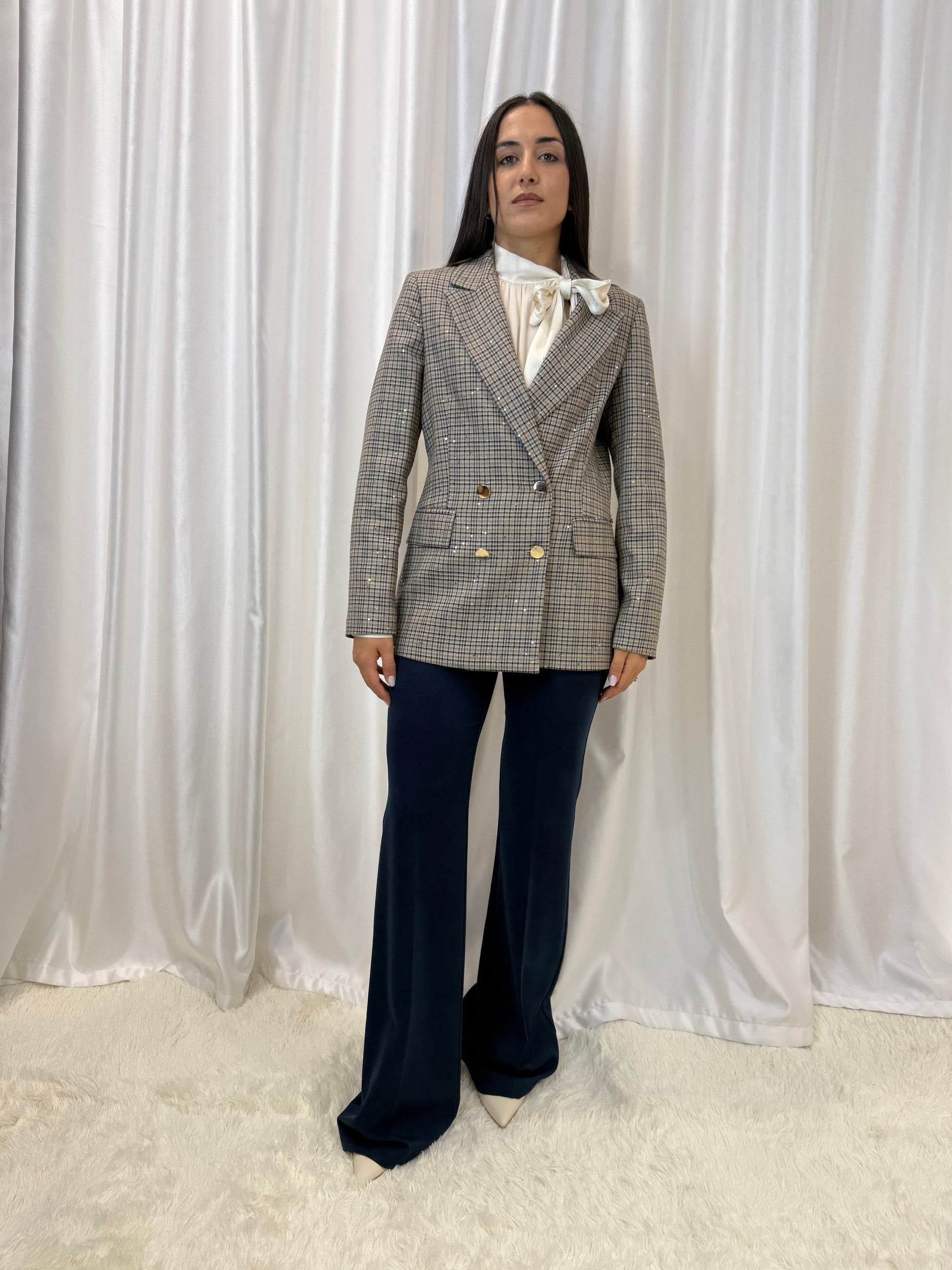 Giacca doppiopetto tartan blu con micro paillettes – Erica Bellucci