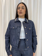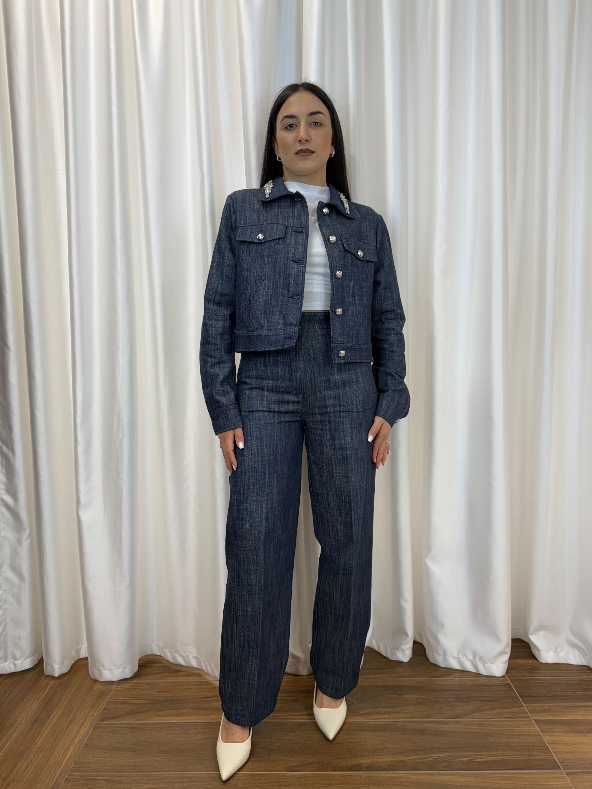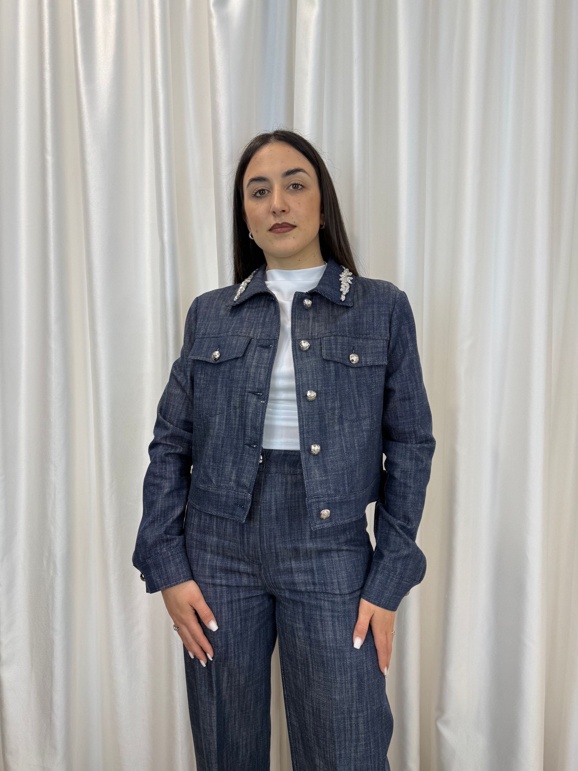 Un capo d’effetto che mixa carattere e femminilità. Questa giacca in denim blu scuro è arricchita da bottoni gioiello e applicazioni luminose sul colletto, per un look chic ma grintoso.