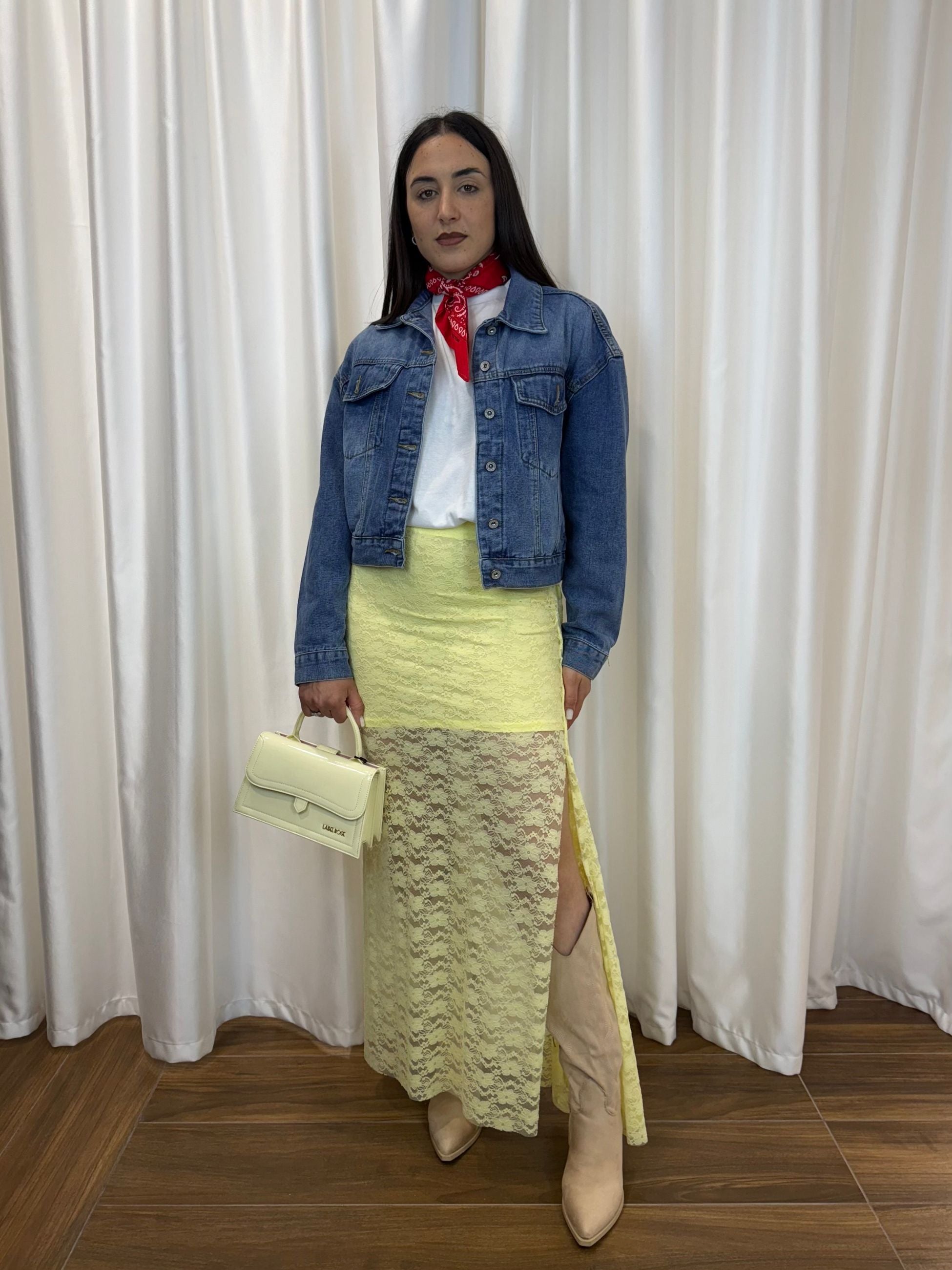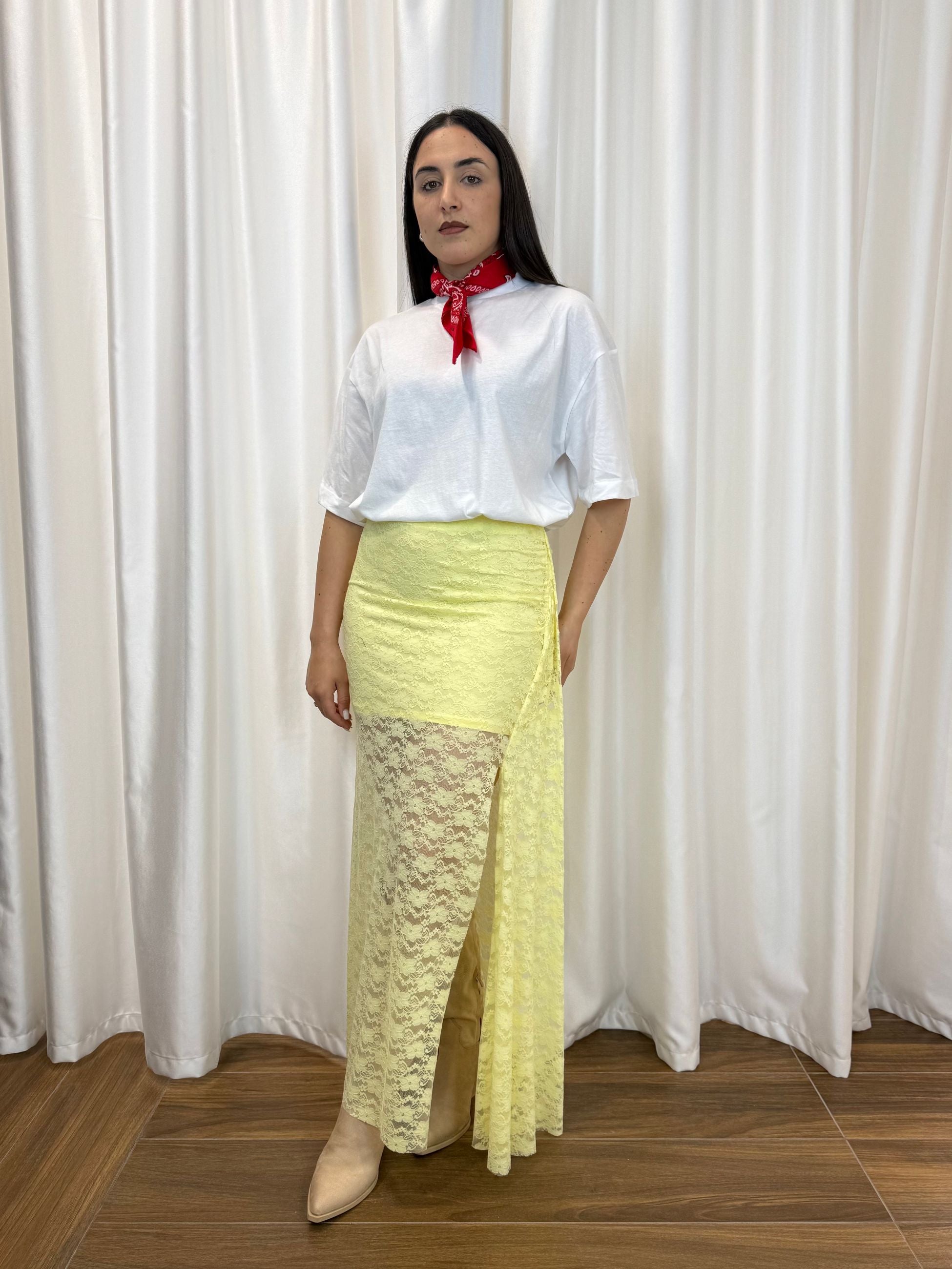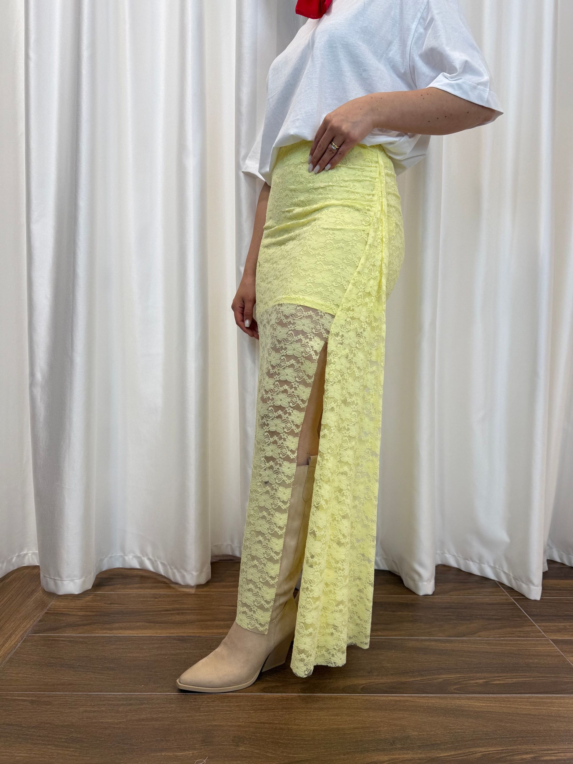 Femminile, luminosa e ricercata: questa gonna in pizzo giallo pastello è perfetta per chi ama distinguersi con delicatezza. La trasparenza elegante e lo spacco laterale donano movimento e sensualità al look.