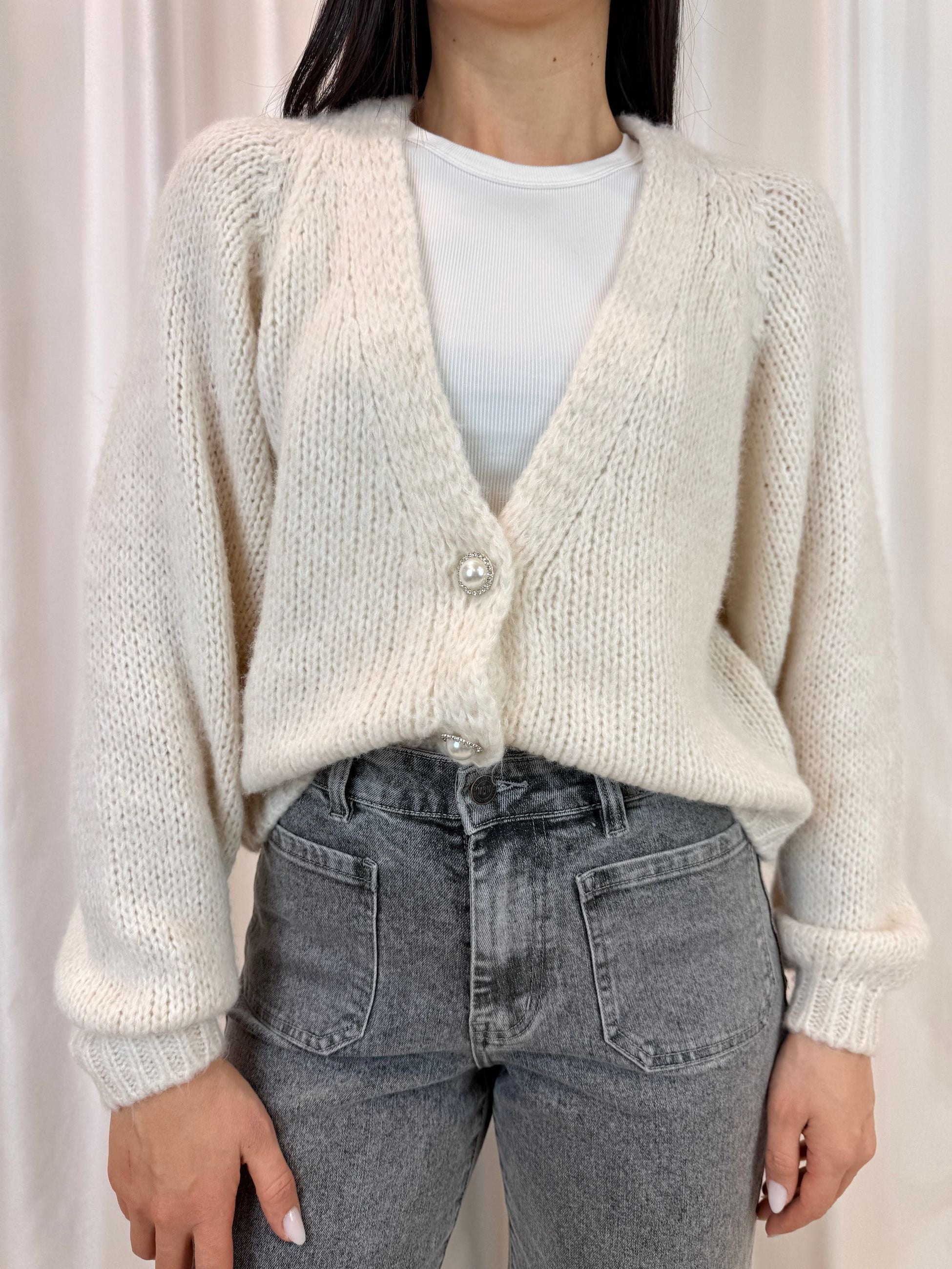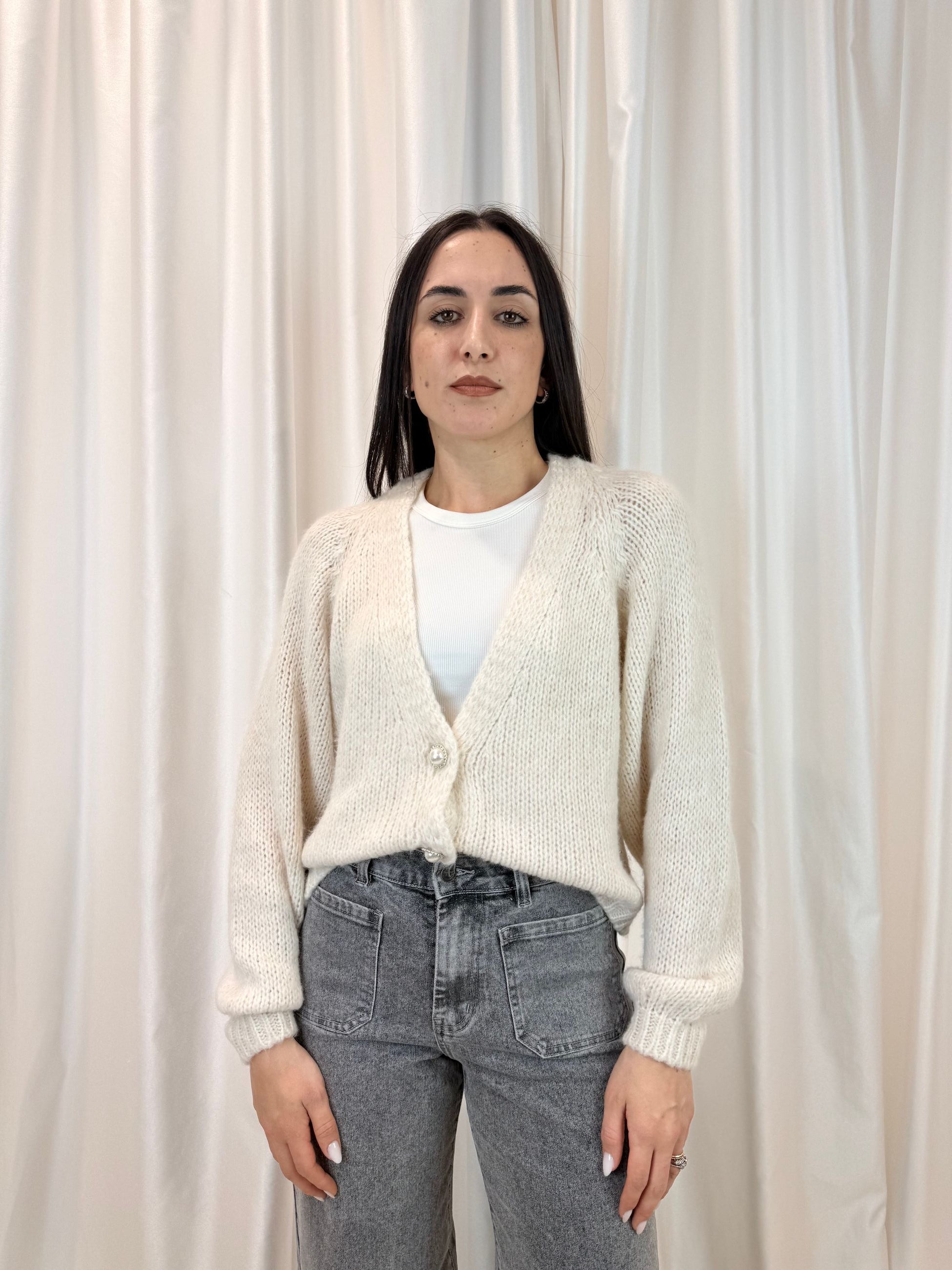 Cardigan Haveone in maglia in misto lana e viscosa. Modello corto con scollo a V e chiusura a bottoni gioiello che donano un dettaglio luminoso e raffinato. Perfetto da indossare con gonne o pantaloni a vita alta per look femminili e moderni.
