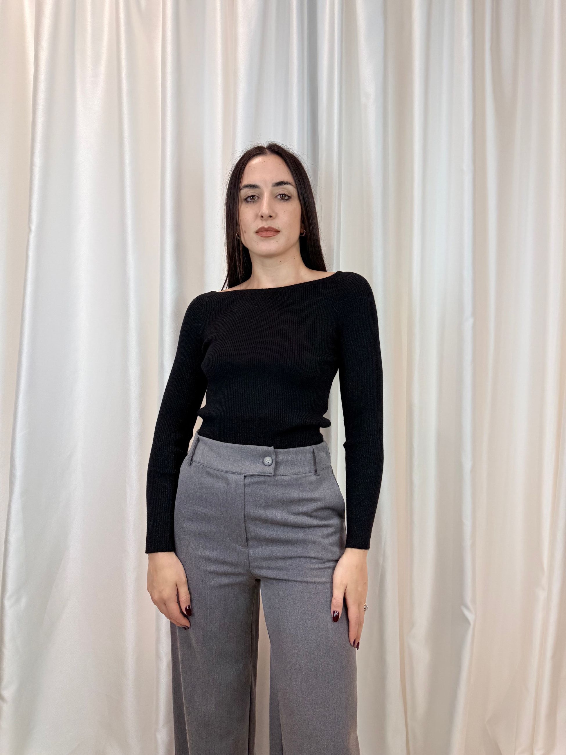 Maglia a coste silver con scollo a barca – Smiling London