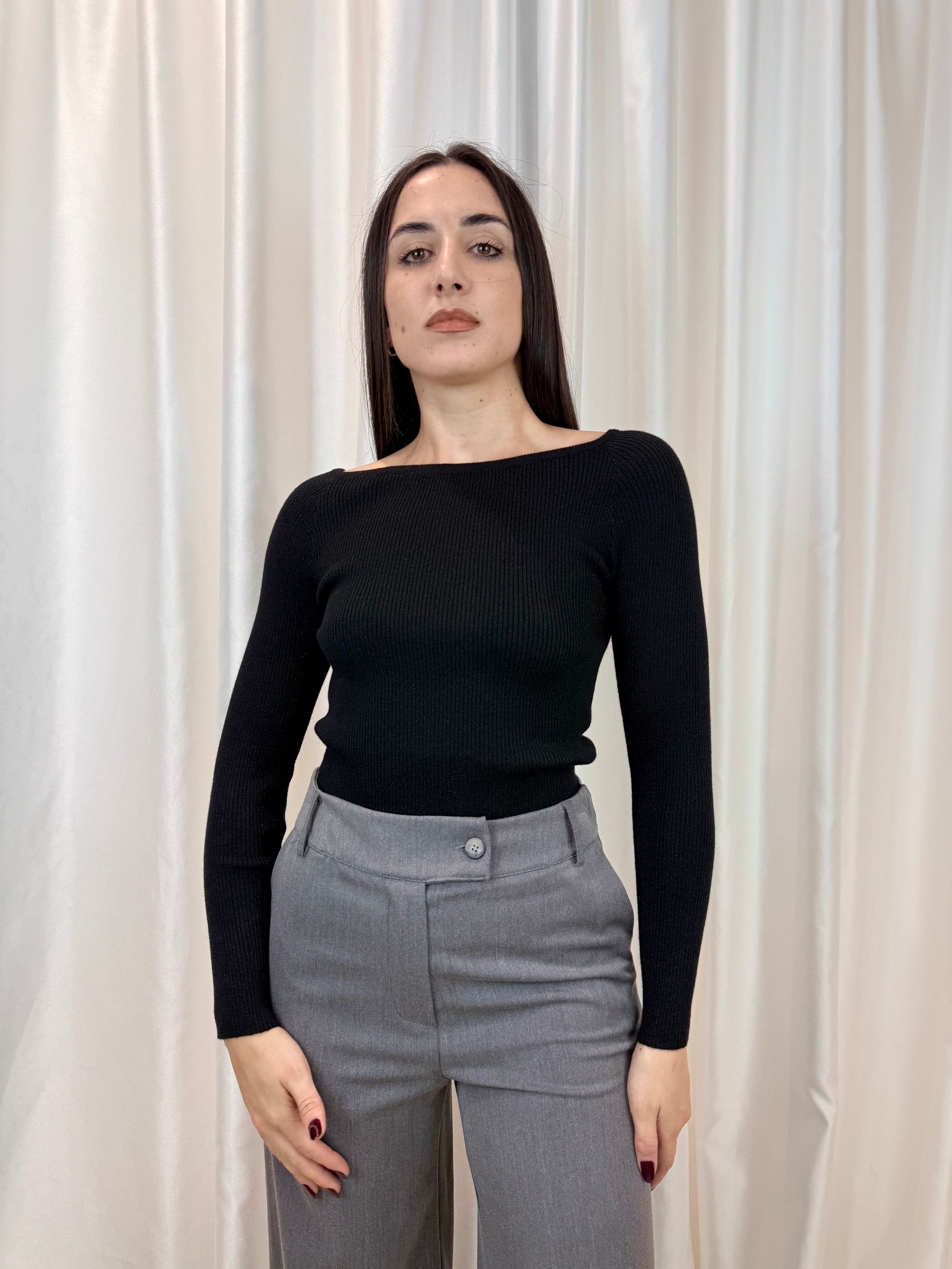 Maglia a coste nero con scollo a barca – Smiling London