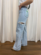 Il denim più cool della stagione! Questi jeans a gamba larga uniscono comfort e stile in un unico capo dal mood casual e femminile. Il lavaggio chiaro e i dettagli strappati sulle gambe donano un tocco urban, perfetto da abbinare a sneakers o tacchi per un look day-to-night.