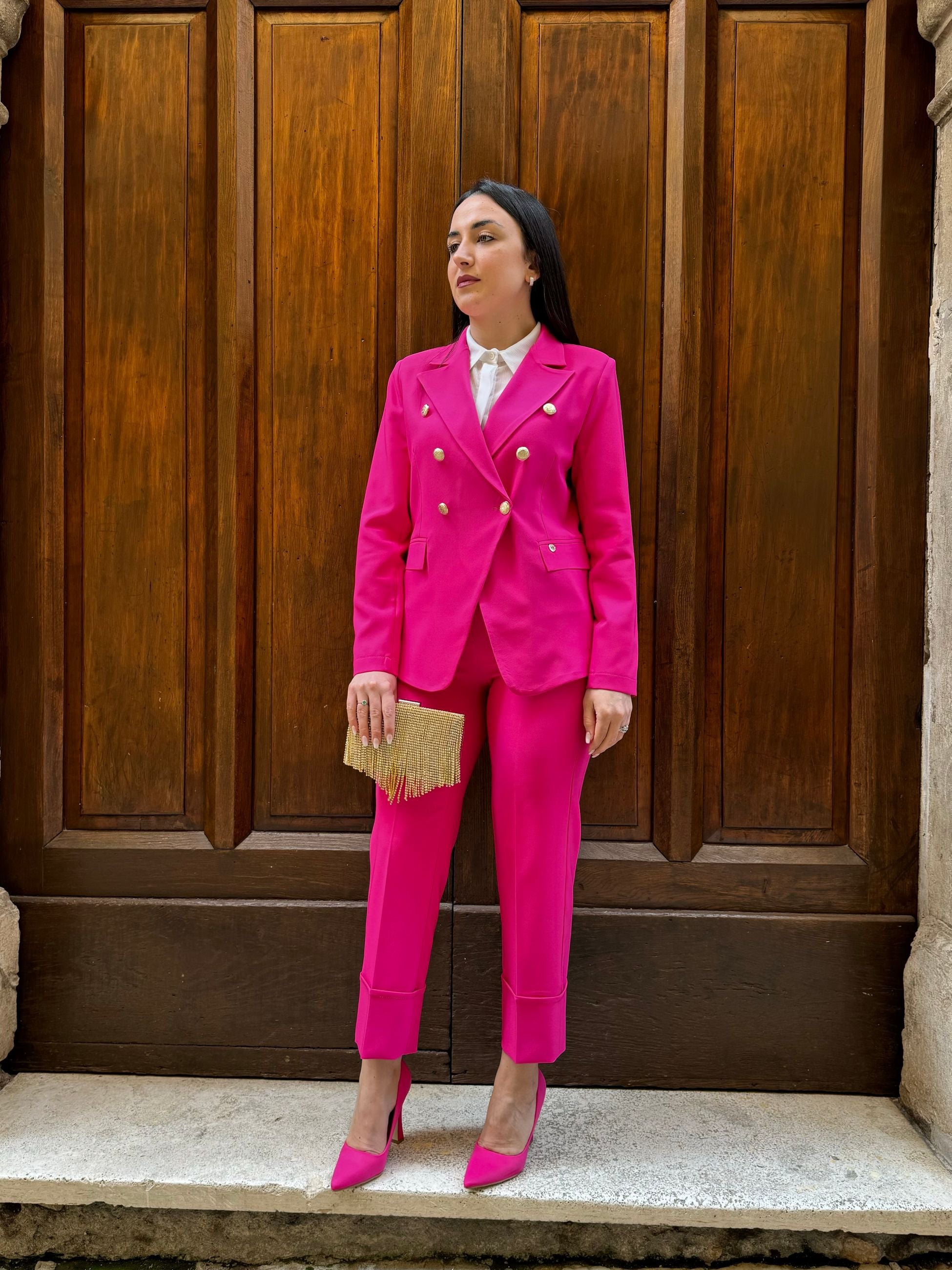 Un tocco di colore per un look raffinato e deciso! Questo pantalone fucsia con fondo risvoltato è perfetto per creare outfit eleganti ma originali. Il taglio dritto, la vita alta e il dettaglio del risvolto lo rendono adatto sia per l’ufficio che per un’occasione speciale.