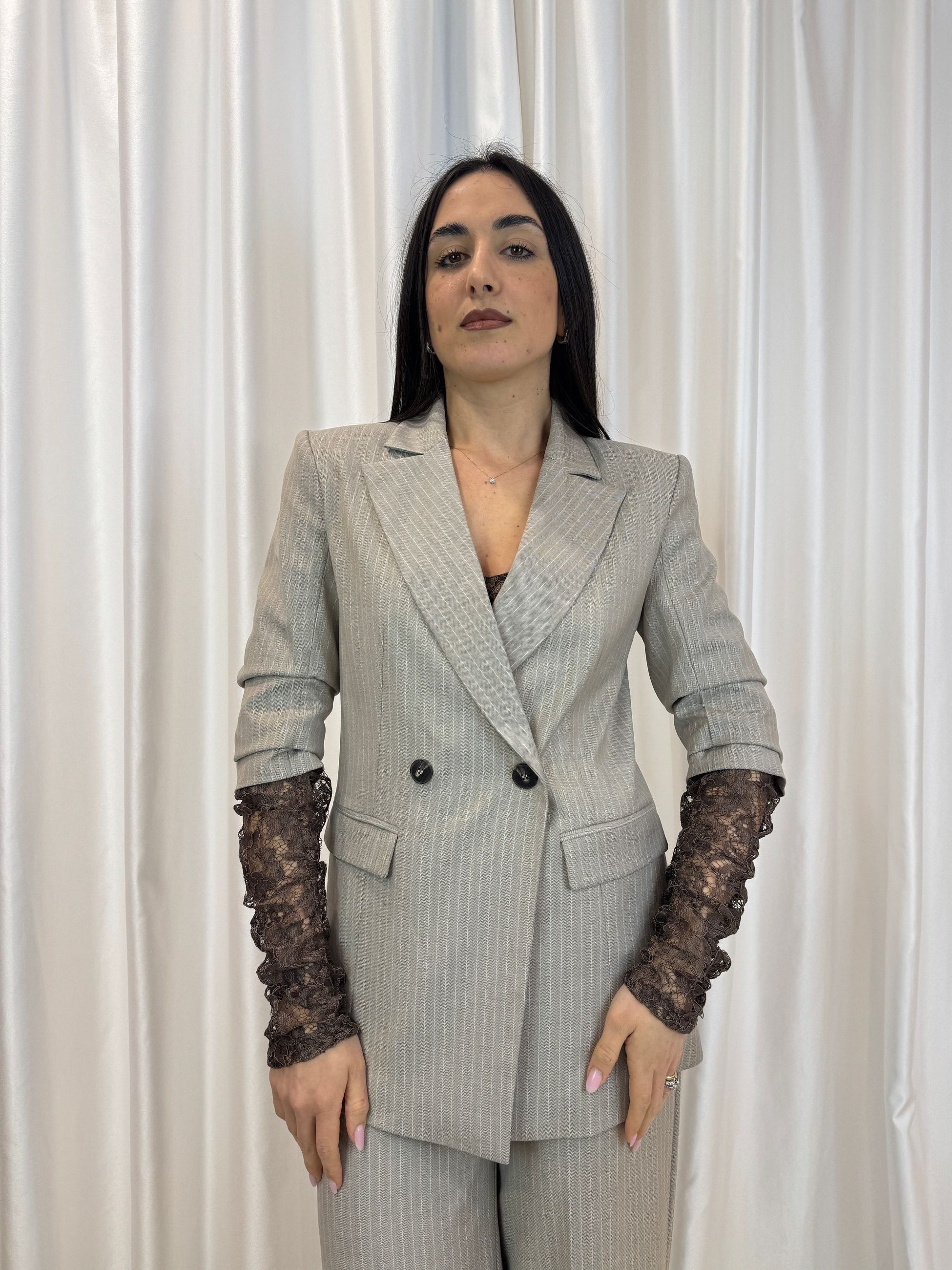 Blazer gessato con maniche in pizzo - Haveone