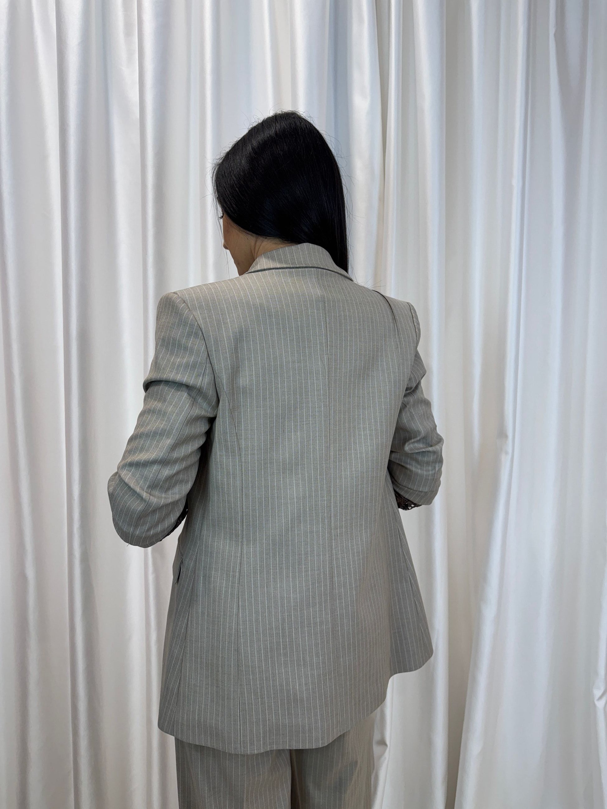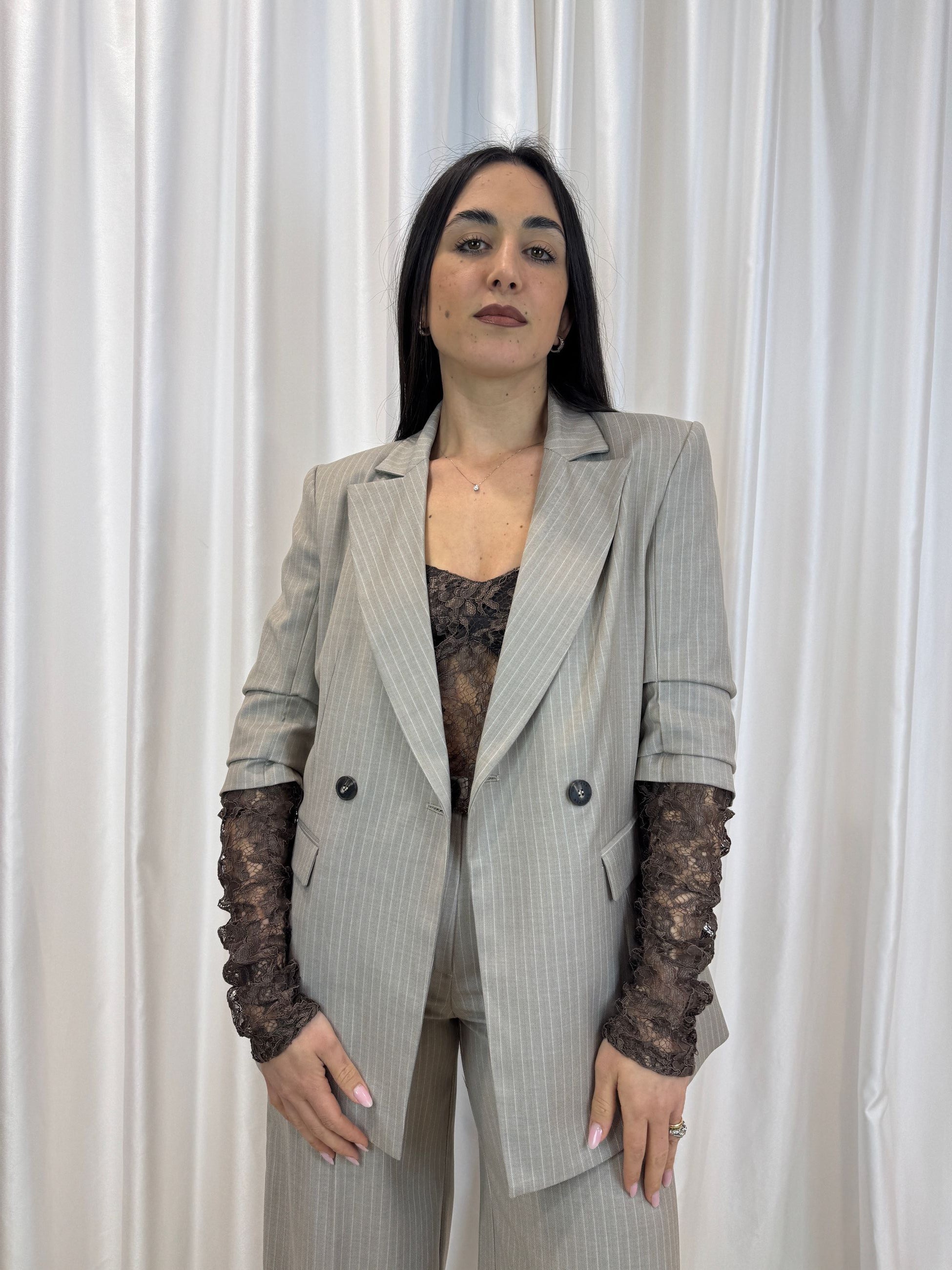 Questo blazer gessato reinterpreta l’eleganza sartoriale con un dettaglio ricercato: le maniche in pizzo, che creano un contrasto sofisticato e femminile.