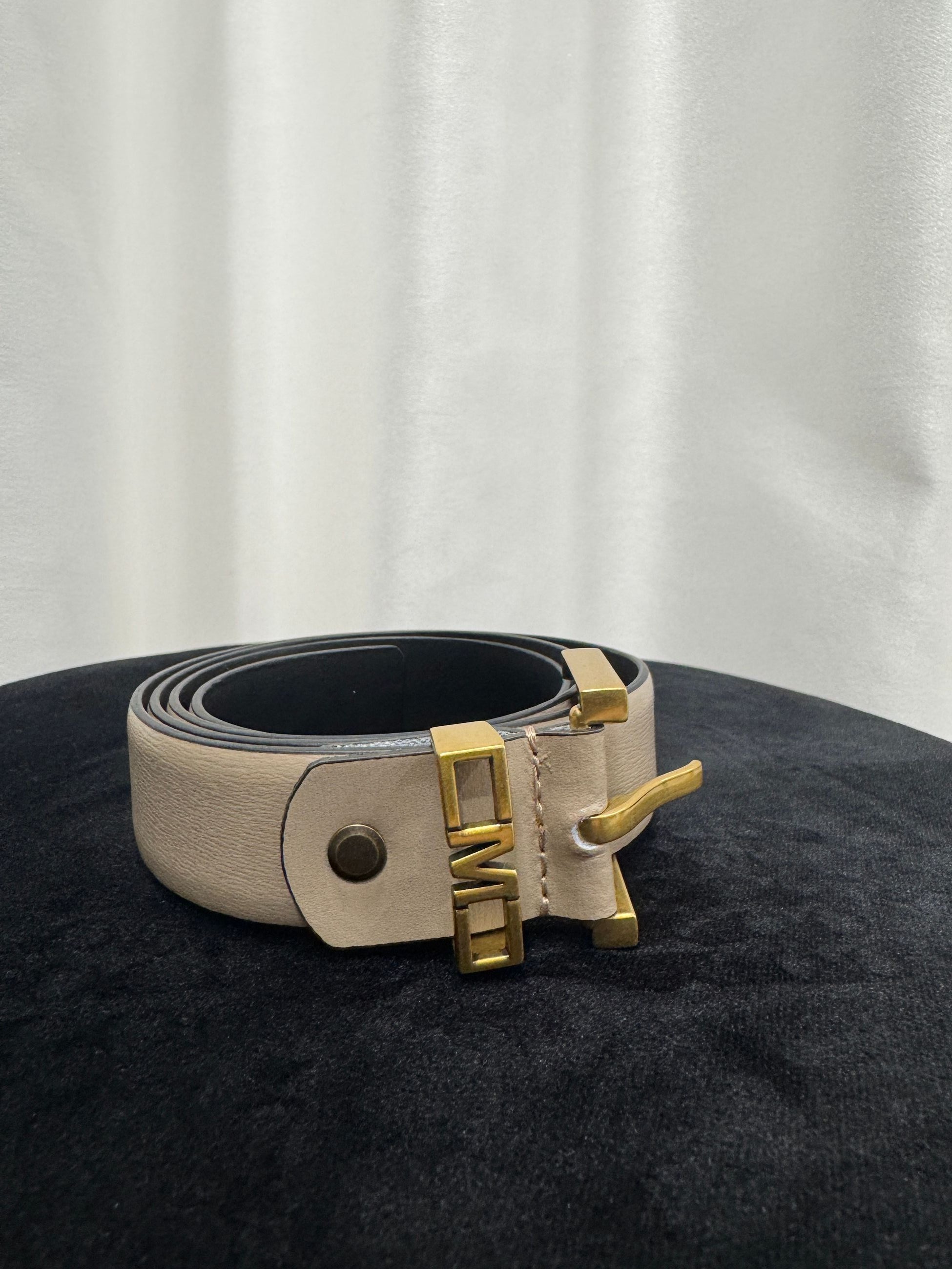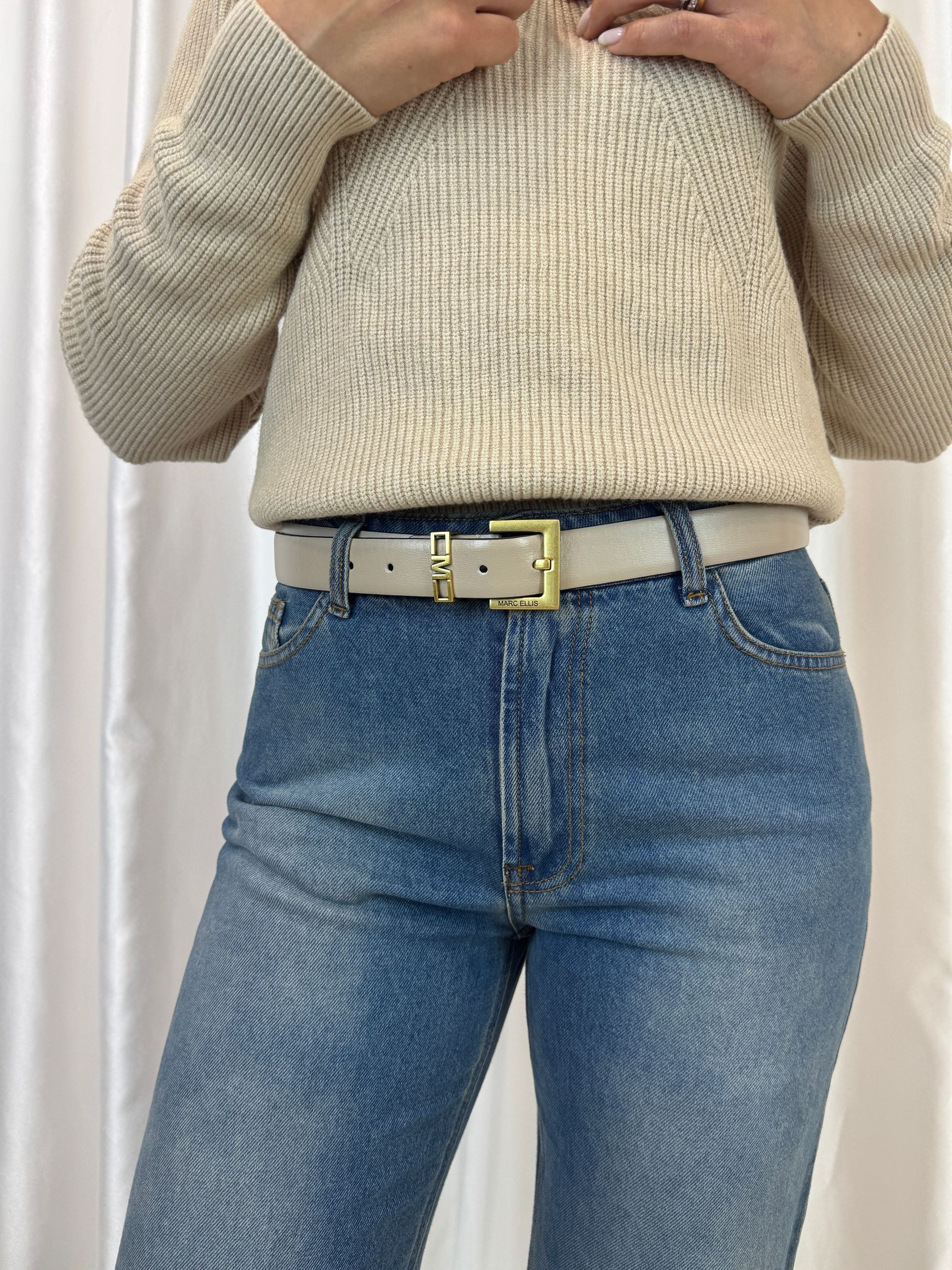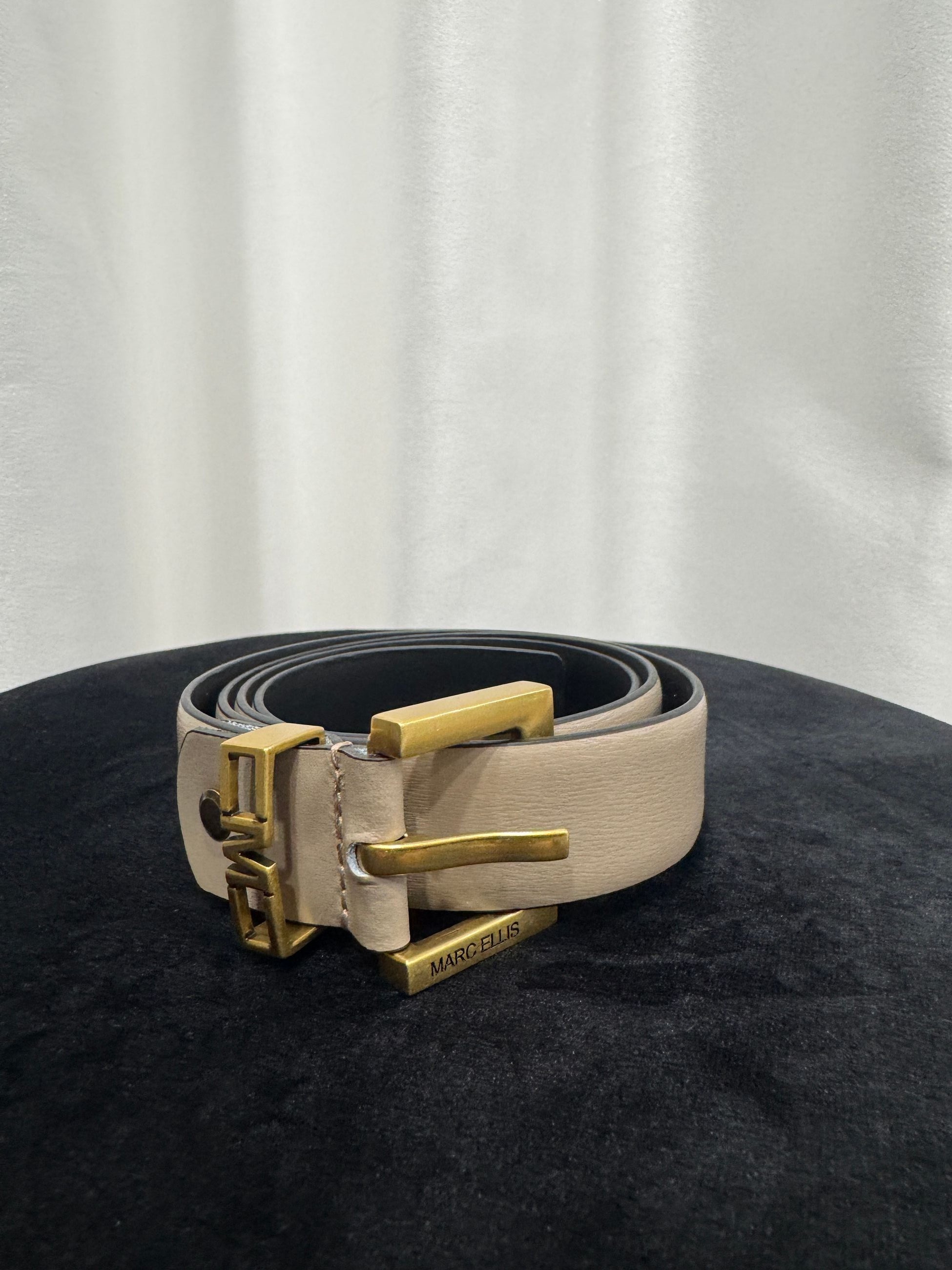 Cintura taupe in vera pelle con fibbia logata ottone – Marc Ellis